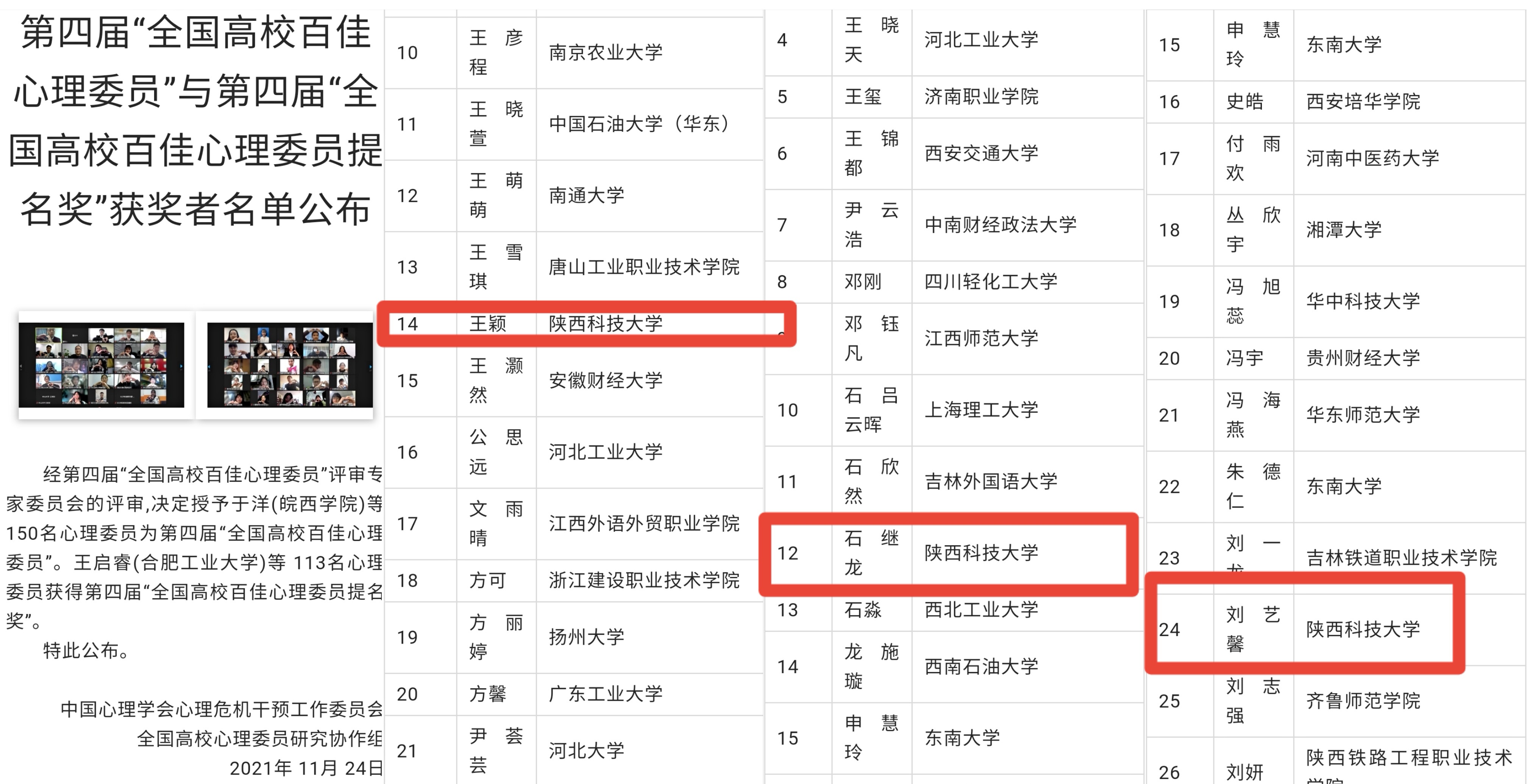 11月24日,由中國心理學會危機干預委員會主辦的第十六屆全國高校心理委員工作研討會暨朋輩心理輔導論壇以線上線下共同開展的方式舉辦,評選了“第四屆全國高校百佳心理委員”。我校食品與生物工程學院教改食品19班王穎榮獲“全國高校百佳心理委員”,電子信息與人工智能學院網(wǎng)絡(luò)192班石繼龍、電氣與控制工程學院電氣191班劉藝馨榮獲“全國高校百佳心理委員提名獎”。