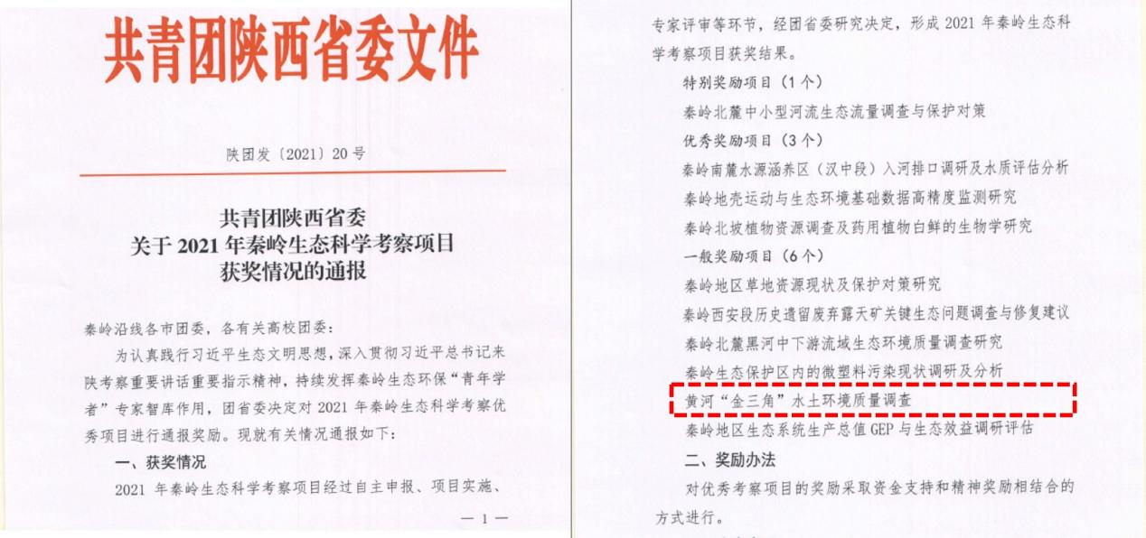 近日,共青團(tuán)陜西省委下發(fā)了《共青團(tuán)陜西省委關(guān)于2021年秦嶺生態(tài)科學(xué)考察項(xiàng)目獲獎(jiǎng)情況的通報(bào)》(陜團(tuán)發(fā)[2021]20號(hào)),對(duì)2021年秦嶺生態(tài)科學(xué)考察優(yōu)秀項(xiàng)目成果進(jìn)行獎(jiǎng)勵(lì)通報(bào)。通過項(xiàng)目申報(bào)、項(xiàng)目實(shí)施、成果匯報(bào)、專家評(píng)審等環(huán)節(jié),經(jīng)團(tuán)省委研究決定,2021年度共評(píng)選出10項(xiàng)優(yōu)秀科考成果。我校環(huán)境科學(xué)與工程學(xué)院牽頭的《黃河金三角水土環(huán)境質(zhì)量調(diào)查》,作為校團(tuán)委指導(dǎo)的唯一入選的黃河專項(xiàng)項(xiàng)目,獲陜西省2021年秦嶺生態(tài)保護(hù)科學(xué)考察一般獎(jiǎng)勵(lì)項(xiàng)目。這也是我校繼2019年《秦嶺土壤污染與修復(fù)現(xiàn)狀調(diào)查》和2020年《秦嶺珍稀野生動(dòng)物棲息地水土環(huán)境重金屬污染現(xiàn)狀調(diào)查》,連續(xù)第三年獲團(tuán)省委優(yōu)秀生態(tài)科學(xué)考察項(xiàng)目獎(jiǎng)勵(lì)。