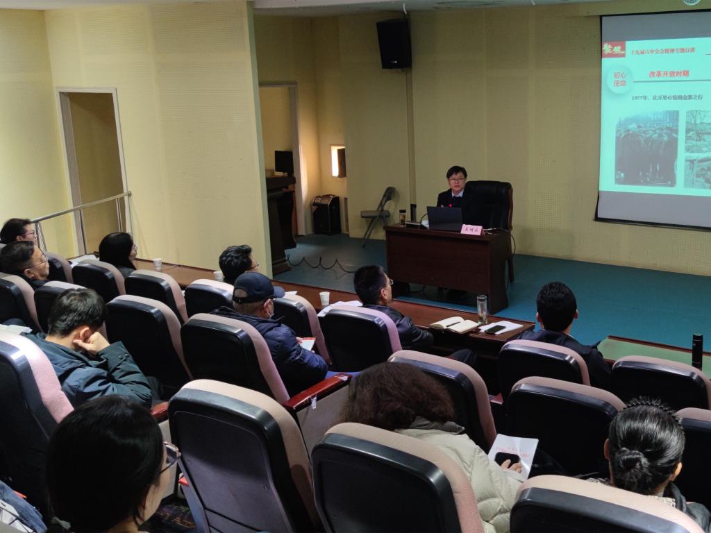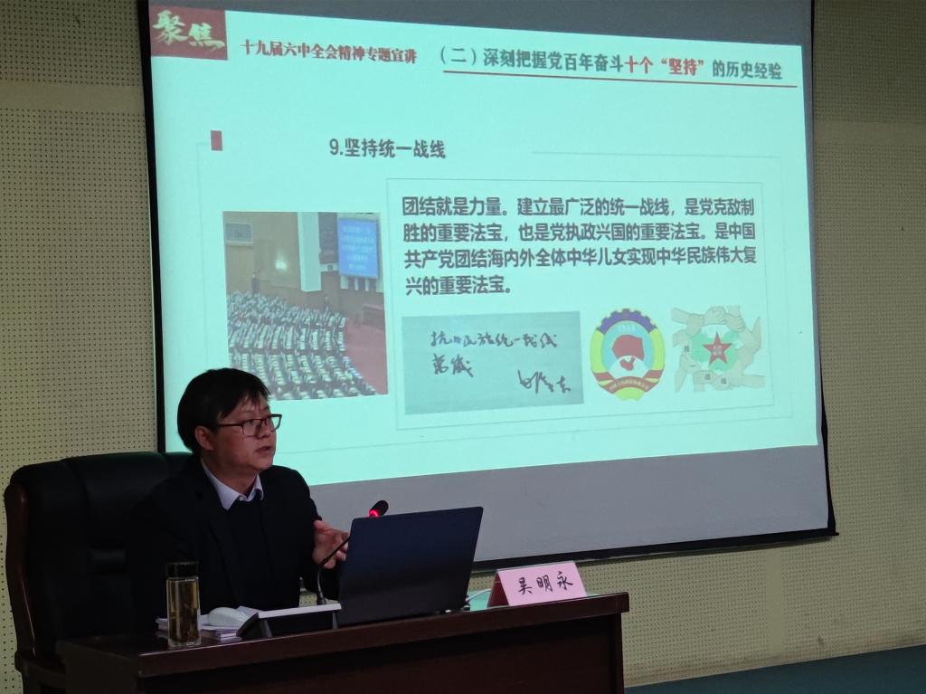 吳明永教授從深刻把握總結(jié)黨的百年奮斗重大成就和歷史經(jīng)驗(yàn)的重大意義、深刻把握黨百年奮斗的初心使命和重大成就、深刻把握中國特色社會(huì)主義新時(shí)代的歷史性成就和歷史性變革、深刻把握黨百年奮斗的歷史意義和歷史經(jīng)驗(yàn)、深刻把握第二個(gè)百年奮斗目標(biāo)的明確要求等五個(gè)方面對(duì)十九屆六中全會(huì)精神進(jìn)行了系統(tǒng)梳理。宣講主題鮮明、脈絡(luò)清晰、內(nèi)容豐富,密切結(jié)合學(xué)校統(tǒng)一戰(zhàn)線工作實(shí)際,為與會(huì)人員認(rèn)真學(xué)習(xí)貫徹黨的十九屆六中全會(huì)精神夯實(shí)了理論基礎(chǔ),提供了重要的學(xué)習(xí)幫助。通過宣講,大家一致認(rèn)為要認(rèn)真學(xué)習(xí)貫徹全會(huì)精神,堅(jiān)持中國共產(chǎn)黨的領(lǐng)導(dǎo),更加緊密地團(tuán)結(jié)在以習(xí)近平同志為核心的黨中央周圍,立足本職工作,提升履職能力,不忘合作初心,勇?lián)鷷r(shí)代責(zé)任,為學(xué)校追趕超越貢獻(xiàn)統(tǒng)戰(zhàn)力量。