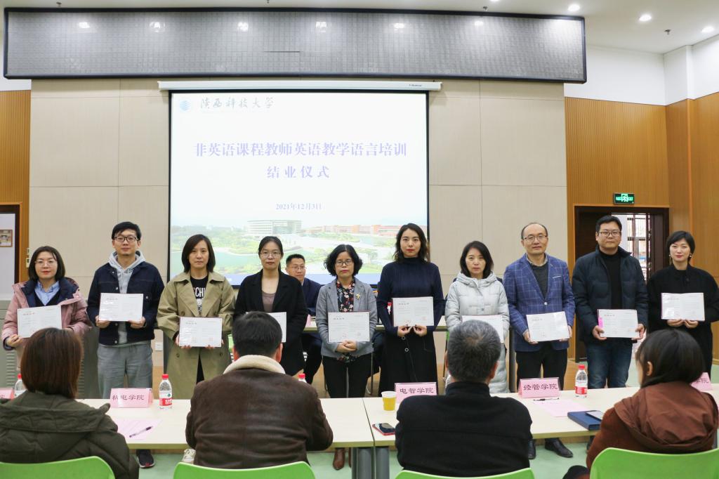 12月3日下午,我校非英語(yǔ)課程教師英語(yǔ)教學(xué)語(yǔ)言培訓(xùn)結(jié)業(yè)儀式在教師發(fā)展中心培訓(xùn)教室舉行。阿爾斯特學(xué)院黨支部副書記、副院長(zhǎng)薛朝華,西安外國(guó)語(yǔ)大學(xué)教育部出國(guó)留學(xué)人員培訓(xùn)部主任李村璞、西安外國(guó)語(yǔ)大學(xué)教育部出國(guó)留學(xué)人員培訓(xùn)部培訓(xùn)項(xiàng)目總負(fù)責(zé)人肖立志、各學(xué)院教學(xué)副院長(zhǎng)及相關(guān)人員出席。