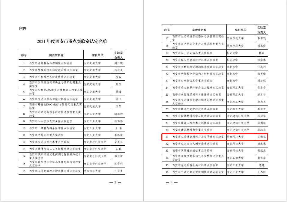 近日,西安市科技局下發(fā)了《西安市科技局關(guān)于認(rèn)定2021年度西安市重點(diǎn)實(shí)驗(yàn)室的通知》(市科辦發(fā)〔2021〕122號(hào)),經(jīng)依托單位推薦、專家評(píng)審、現(xiàn)場(chǎng)考察、網(wǎng)上公示等程序,我?;瘜W(xué)與化工學(xué)院王?;ń淌趫F(tuán)隊(duì)申報(bào)的“西安市先端性能材料與高分子重點(diǎn)實(shí)驗(yàn)室”成功獲批為西安市重點(diǎn)實(shí)驗(yàn)室。