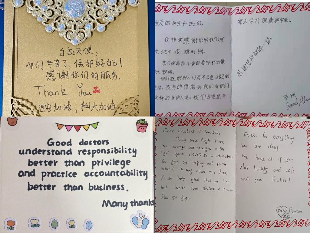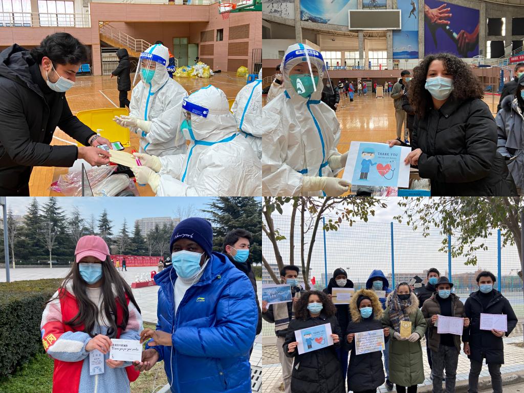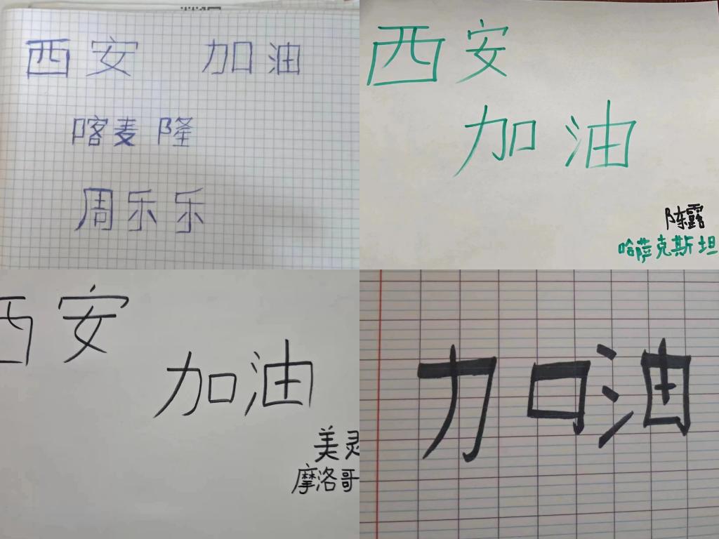 12月27日,寒風(fēng)料峭,疫情形勢(shì)仍然嚴(yán)峻,在學(xué)校的統(tǒng)一安排下,國(guó)際學(xué)生又一次有序進(jìn)行核酸檢測(cè)。為了表達(dá)自己對(duì)基層防疫人員的敬意和感謝,國(guó)際學(xué)生精心制作了感謝卡,并在核酸檢測(cè)現(xiàn)場(chǎng)贈(zèng)予了醫(yī)護(hù)人員,溫暖的語(yǔ)言也溫暖了一線防疫人員的心。遠(yuǎn)在境外的國(guó)際學(xué)生在漢語(yǔ)課上聽老師講述了西安近期的疫情,他們紛紛用漢字寫下對(duì)西安最美好的祝福。