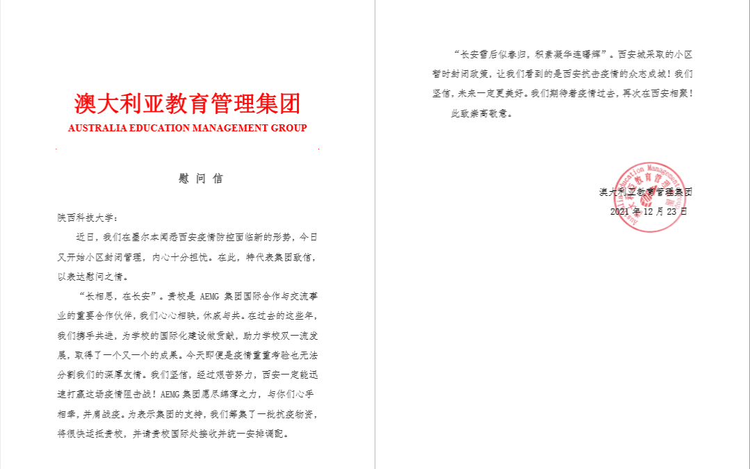 疫情牽動人心,支援驅(qū)散嚴(yán)寒。在我校嚴(yán)格落實(shí)陜西省新冠肺炎疫情防控要求、積極抗疫之初,澳大利亞教育管理集團(tuán)(AEMG)第一時(shí)間向我校發(fā)來慰問信,表達(dá)關(guān)心與惦念,此次又向我校捐贈一批防疫物資30余箱。