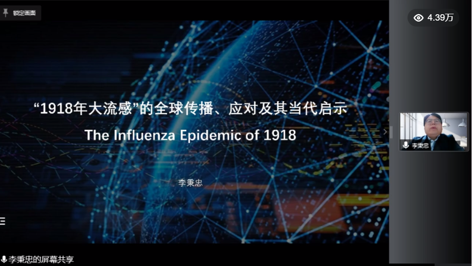 1月6日晚,陜西師范大學(xué)李秉忠教授做客我?!爸琳\至博云講堂”第四講,面向全校師生作了題為“‘1918大流感’的全球傳播、應(yīng)對及當代啟示”的報告,超4.7萬人在線觀看。報告會由校團委書記李鵬主持。
