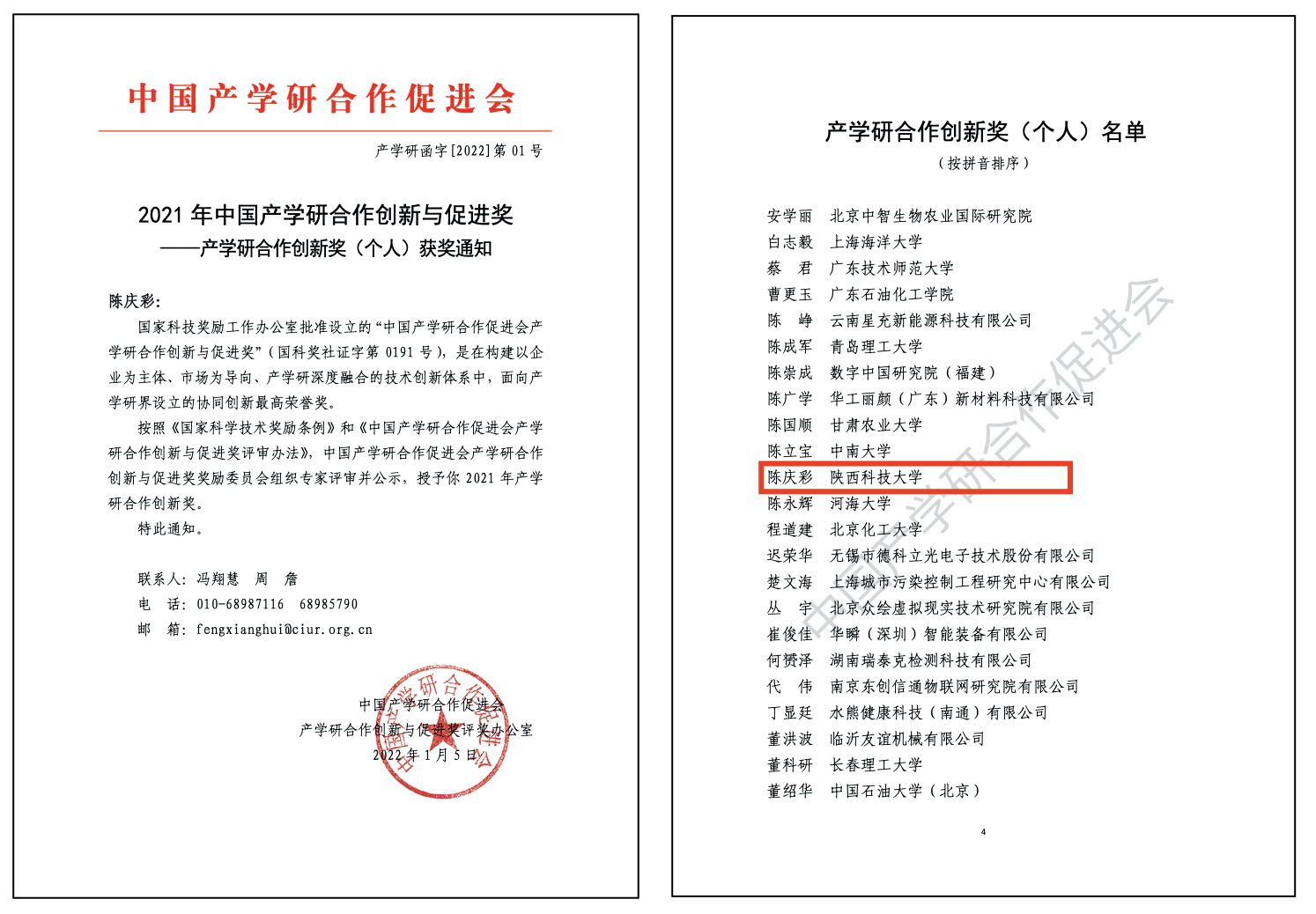 近日,中國產(chǎn)學(xué)研合作創(chuàng)新與促進會公布了“2021年中國產(chǎn)學(xué)研合作創(chuàng)新與促進獎”獲獎名單,我校環(huán)境科學(xué)與工程學(xué)院陳慶彩教授榮獲“2021年中國產(chǎn)學(xué)研合作創(chuàng)新獎(個人)”,這是我校首次榮獲該項榮譽。中國產(chǎn)學(xué)研合作創(chuàng)新與促進獎是由中國科技部和國家科技獎勵辦公室批準(zhǔn)設(shè)立,面向國內(nèi)在促進產(chǎn)學(xué)研合作及創(chuàng)新方面作出突出貢獻(xiàn)的單位及個人所頒發(fā)的年度最高榮譽獎,是我國在產(chǎn)學(xué)研合作方面的第一個全國性獎項。