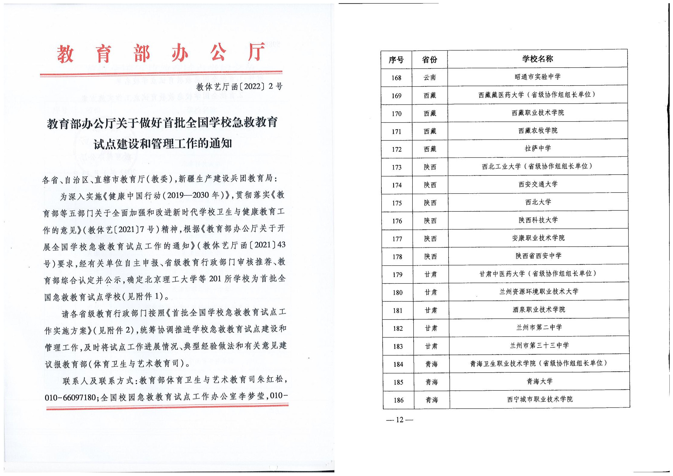 近日,教育部辦公廳下發(fā)《關(guān)于做好首批全國學(xué)校急救教育試點(diǎn)建設(shè)和管理工作的通知》(教體藝廳函[2022]2號),我校成功獲選首批全國學(xué)校急救教育試點(diǎn)學(xué)校,為陜西僅有的兩所省屬高校之一。