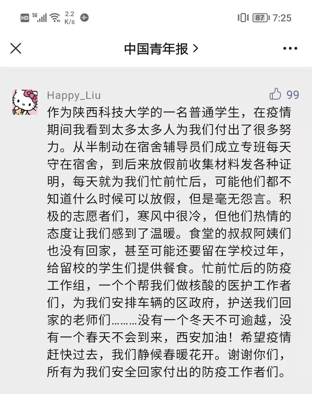 在終端,輔導(dǎo)員老師們也是24小時在線,“真的沒想到,呂老師能在凌晨4點給我送來離市證明,我又能回家了,真是太高興了!”輕工學(xué)院彭浩銘同學(xué)激動地說,原來因為遲遲得不到屬地疫情防控政策的確切消息,他的離校信息提交得晚了,他覺得第二天回家肯定沒戲了,但在凌晨4點,輔導(dǎo)員呂霞將離市證明送到了他手中,呂霞說:“臨近春節(jié),同學(xué)們都迫切地想要和家人團(tuán)聚,作為輔導(dǎo)員就是盡力滿足同學(xué)們的愿望。”
