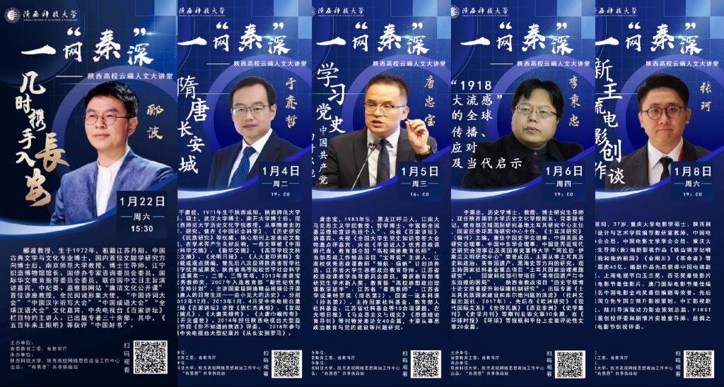 1月4日至22日,由陜西省委教育工委、陜西省教育廳主辦,陜西科技大學(xué)、陜西高校網(wǎng)絡(luò)思想政治工作中心承辦,“有易思”共享供給站出品的“一網(wǎng)‘秦’深——陜西高校云端人文大講堂”通過(guò)網(wǎng)絡(luò)平臺(tái)正式播出。通過(guò)邀請(qǐng)學(xué)識(shí)淵博的學(xué)術(shù)泰斗、思想敏銳的青年才俊,開(kāi)展了一系列戰(zhàn)“疫”云端報(bào)告,給陜西高校師生帶來(lái)精彩的文化盛宴。截至目前,在線觀看人數(shù)累計(jì)已超過(guò)30萬(wàn)。