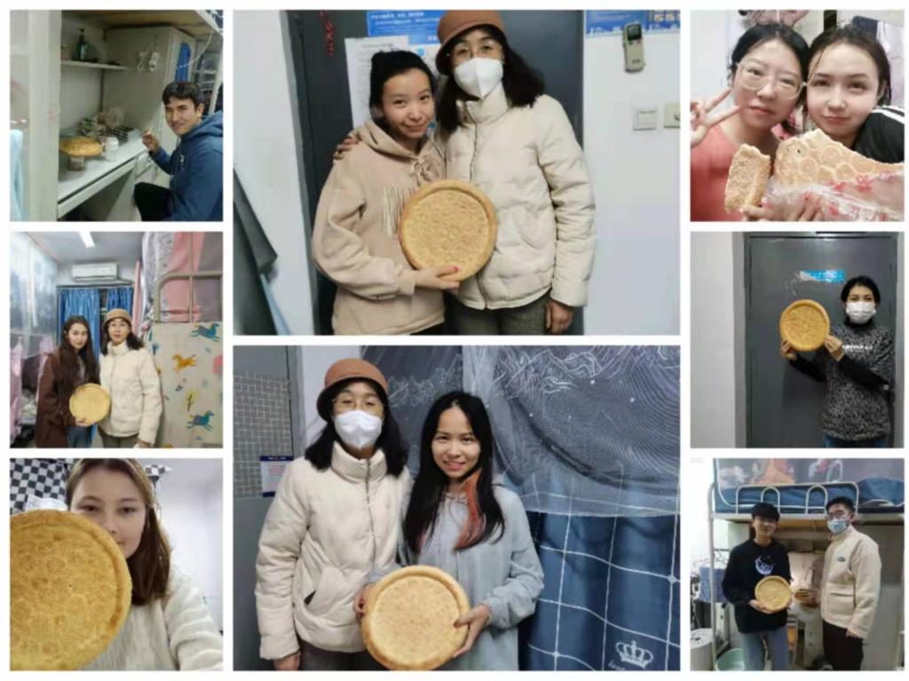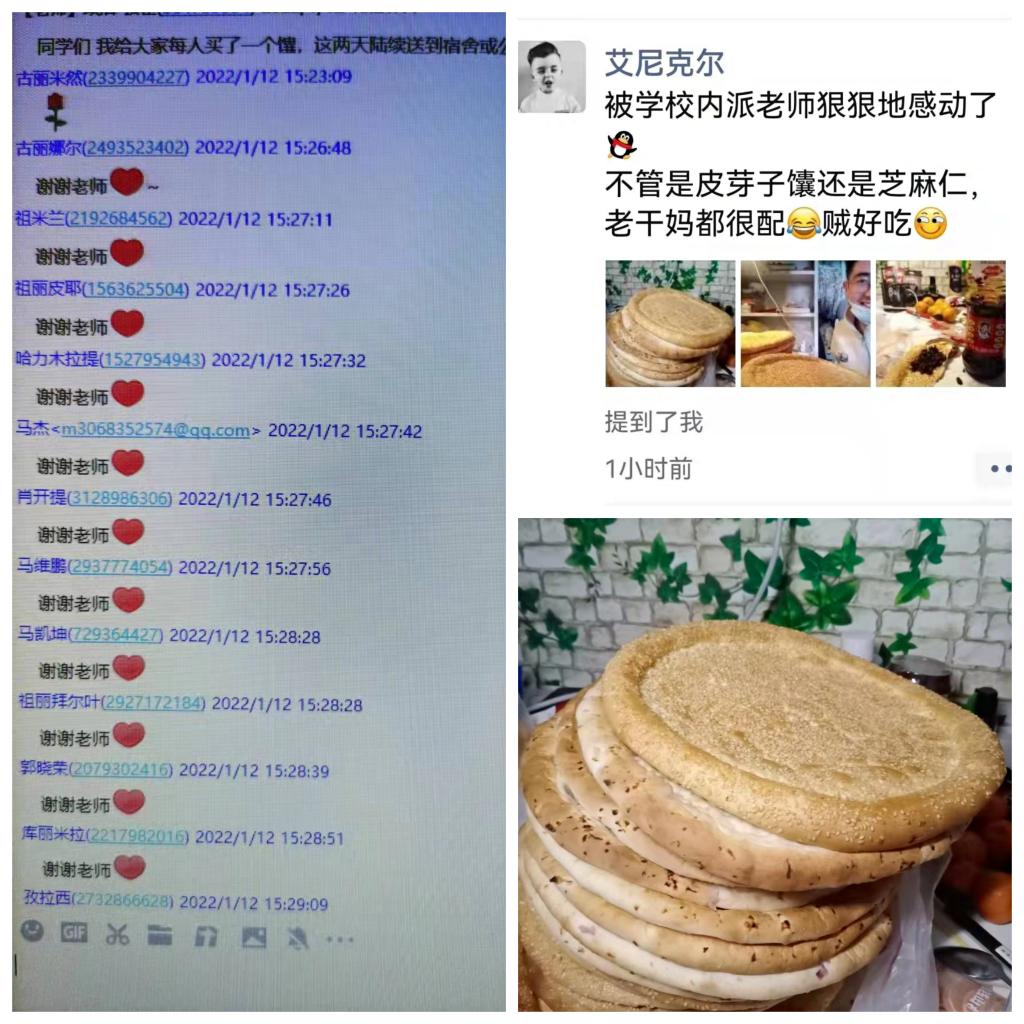 新疆駐我校教師朱淑萍通過談心談話,了解到少數(shù)民族學(xué)生有的很小就住校學(xué)習,有的高中就到內(nèi)地讀書,與家人聚少離多,很多同學(xué)時常表達濃濃的思鄉(xiāng)之情。為撫慰在宿舍半制動學(xué)生的心情,朱老師積極聯(lián)系商家,自費為我校新疆少數(shù)民族學(xué)生每人贈送了一塊地道的新疆馕?!扳未砑椋野衙篮玫淖T杆徒o我的學(xué)生”朱老師如是說。送到學(xué)生手里時,馕還是熱的。預(yù)科班學(xué)生巴合江·加林說:“疫情阻擋不了愛,一份溫暖的禮物、一份家鄉(xiāng)的味道、一份未來的希望,代表了師生共情,民族團結(jié)的力量”。