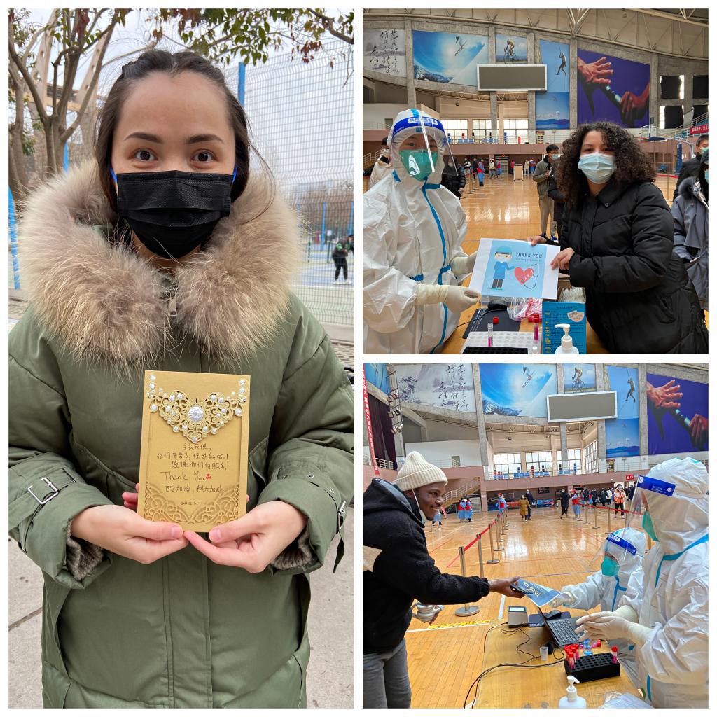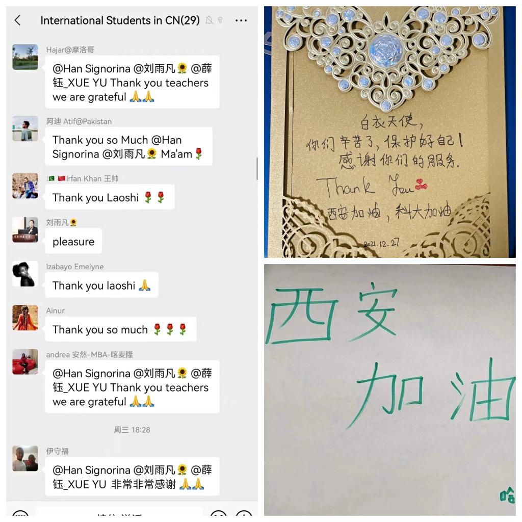 全球疫情蔓延,留學(xué)生們紛紛表示,中國(guó)是最安全的地方、學(xué)校是最保險(xiǎn)的區(qū)域。來自哈薩克斯坦的博士研究生Ainur(愛琳)制作的精美手卡,寫道:“白衣天使,你們辛苦了!保護(hù)好自己,感謝你們得服務(wù)。”看到醫(yī)護(hù)人員每天從早到晚為大家做核酸,不知如何表達(dá)感激之情的留學(xué)生們,用稚嫩的筆觸、青澀的口吻,真情流露。國(guó)際處的老師時(shí)常提醒他們注意防護(hù),保持積極的心態(tài)。說到過年是否回國(guó),他們大都表示會(huì)在陜過年。比起回家,留在中國(guó),留在學(xué)校,更安全。
