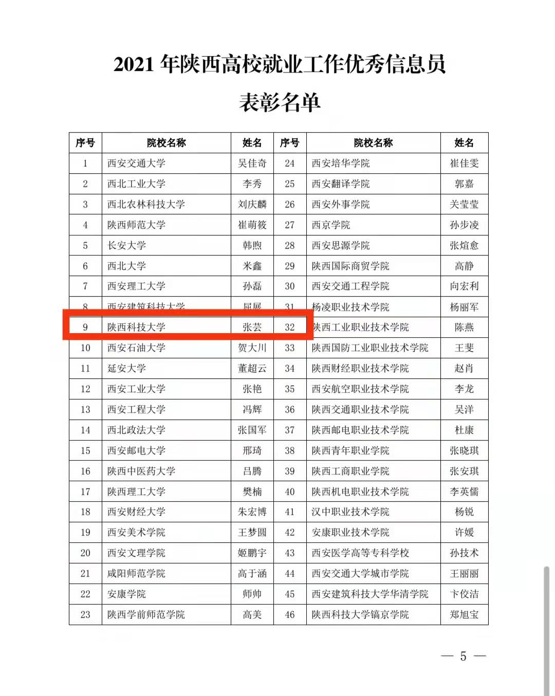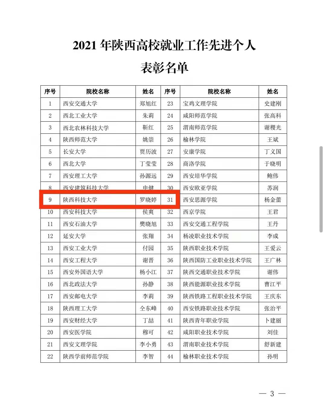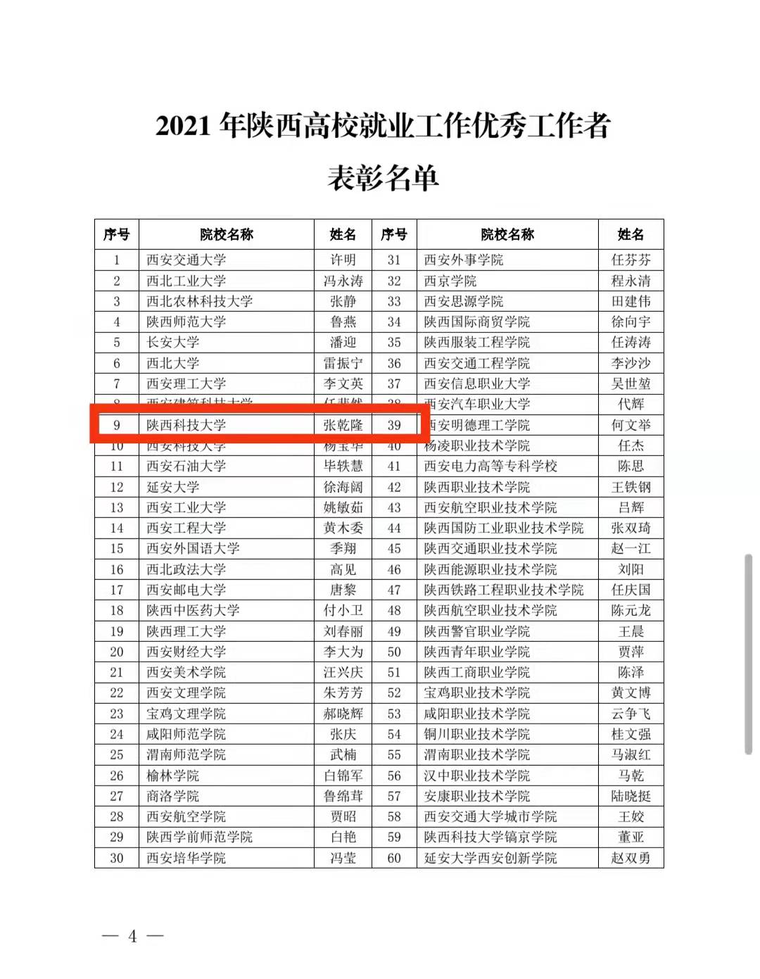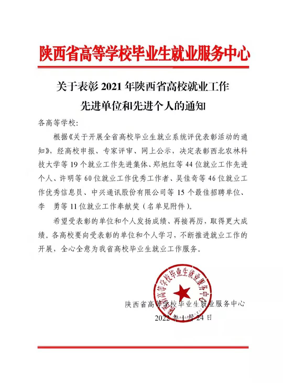 近日,陜西省高等學(xué)校畢業(yè)生就業(yè)服務(wù)中心印發(fā)《關(guān)于表彰2021年陜西省高校就業(yè)工作先進單位和先進個人的通知》,我校榮獲2021年陜西高校就業(yè)工作“先進集體”,就業(yè)指導(dǎo)中心羅曉婷同志榮獲2021年陜西高校就業(yè)工作“先進個人”,輕工科學(xué)與工程學(xué)院黨委副書記張乾隆同志榮獲2021年陜西高校就業(yè)工作“優(yōu)秀工作者”,就業(yè)指導(dǎo)中心張蕓同志榮獲2021年陜西高校就業(yè)工作“優(yōu)秀信息員”。