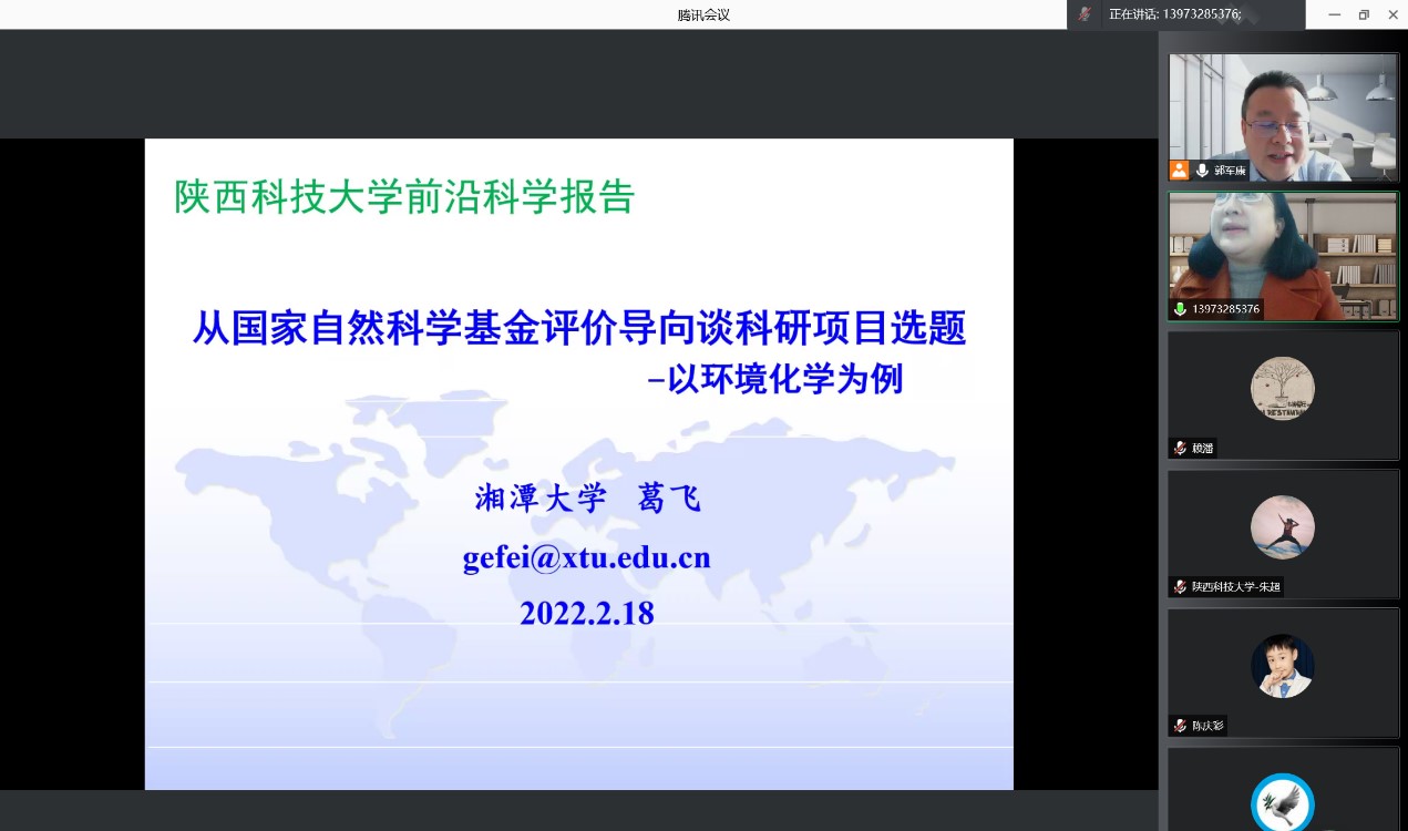 2月18日,應(yīng)我校環(huán)境科學(xué)與工程學(xué)院邀請,湘潭大學(xué)副校長葛飛教授做客我校線上“前沿科學(xué)報告”,本次報告會由科技處主辦,環(huán)境科學(xué)與工程學(xué)院承辦。環(huán)境學(xué)院及其他兄弟院校、科研院所師生300余人參加會議。會議由副校長黃劍鋒教授主持。