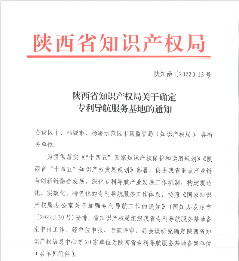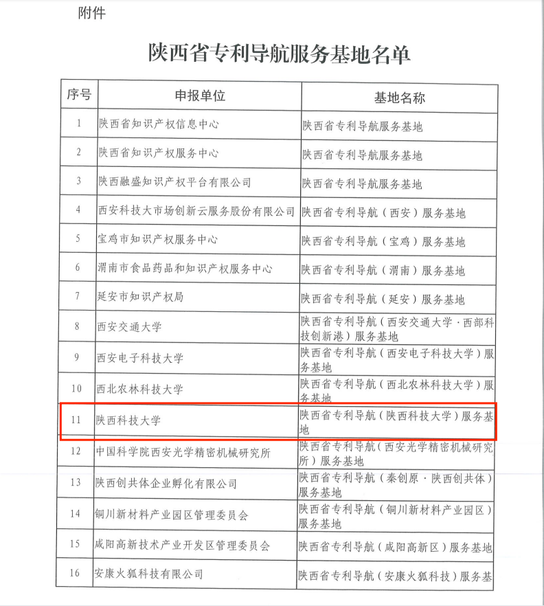 近日,陜西省知識產(chǎn)權(quán)局公布了《陜西省知識產(chǎn)權(quán)局關(guān)于確定專利導(dǎo)航服務(wù)基地的通知》(陜知函〔2022〕13號),全省總共建設(shè)專利導(dǎo)航服務(wù)基地20個,僅有四所高校獲批,分別是西安交通大學(xué)、西安電子科技大學(xué)、西北農(nóng)林科技大學(xué)、陜西科技大學(xué)。我校作為唯一入選的省屬高校成為陜西省專利導(dǎo)航服務(wù)基地建設(shè)單位之一。此次獲批是我校深化實施創(chuàng)新驅(qū)動發(fā)展戰(zhàn)略,強化知識產(chǎn)權(quán)創(chuàng)造、保護和運用,扎實推進科技成果轉(zhuǎn)移轉(zhuǎn)化的又一次突破。