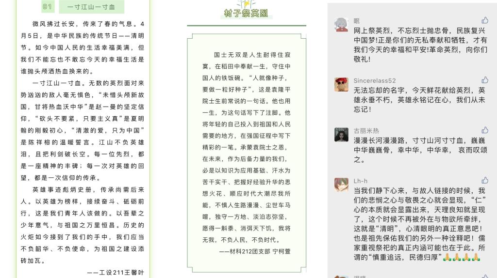 為傳承弘揚英烈事跡和精神,引領(lǐng)廣大團員青年崇尚、緬懷、學習、捍衛(wèi)英烈風尚,校團委于清明節(jié)前組織各學院團委、學生組織結(jié)合愛國主義教育、傳統(tǒng)文化教育和革命傳統(tǒng)教育開展“線上祭英烈”系列主題教育活動,各分團委、團學組織積極組織開展了一系列有實效、有特色的主題教育活動,共同緬懷先烈、寄托哀思,號召團員青年繼承革命傳統(tǒng)、弘揚愛國精神,以實際行動踐行社會主義核心價值觀,為實現(xiàn)“中國夢”貢獻自己的力量。