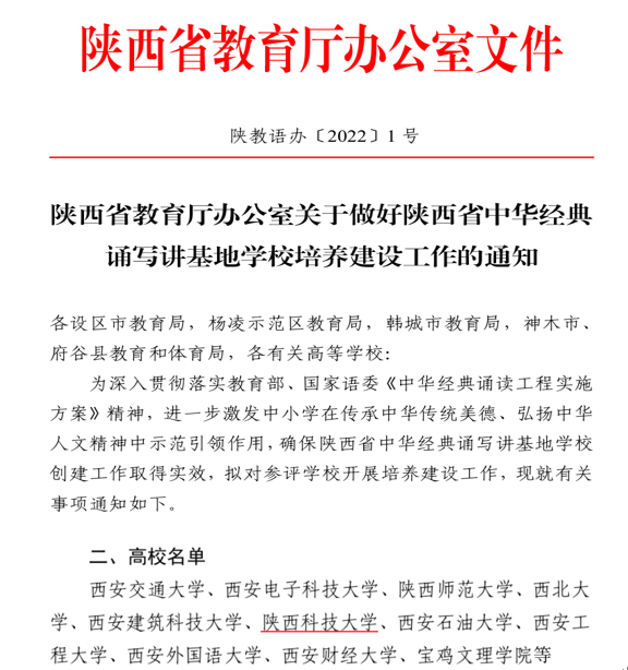 近日,陜西省教育廳辦公室發(fā)布了《關(guān)于做好陜西省中華經(jīng)典誦寫講基地學(xué)校培養(yǎng)建設(shè)工作的通知》(陜教語辦〔2022〕1號(hào)),我校獲批陜西省首批中華經(jīng)典誦寫講基地學(xué)校。