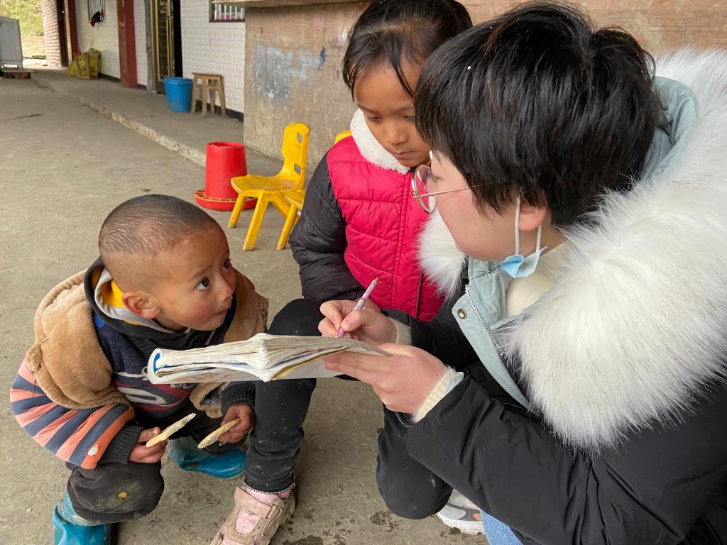第22屆研究生支教團成員王婉妮下鄉(xiāng)家訪中為學生的妹妹講題