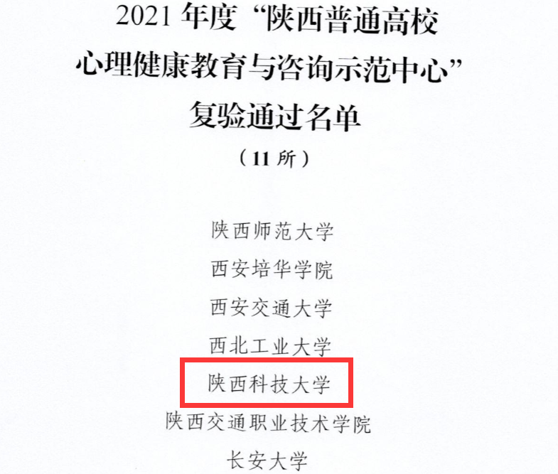 近日,陜西省委教育工委發(fā)布《中共陜西省委教育工委關(guān)于公布2021年度陜西高校心理健康教育與咨詢標(biāo)準(zhǔn)化中心驗(yàn)收和示范中心復(fù)驗(yàn)結(jié)果的通知》,我校順利通過(guò)復(fù)驗(yàn)。