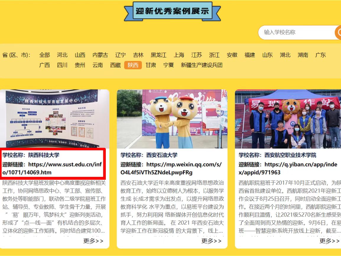 近日,由教育部易班發(fā)展中心舉辦的2021年迎新優(yōu)秀工作案例全國征集活動落下帷幕。本次征集面向全國1700余所共建高校開展,最終114個迎新案例進(jìn)入展示環(huán)節(jié),我校《“易”眼萬年,筑夢科大》成功入選。