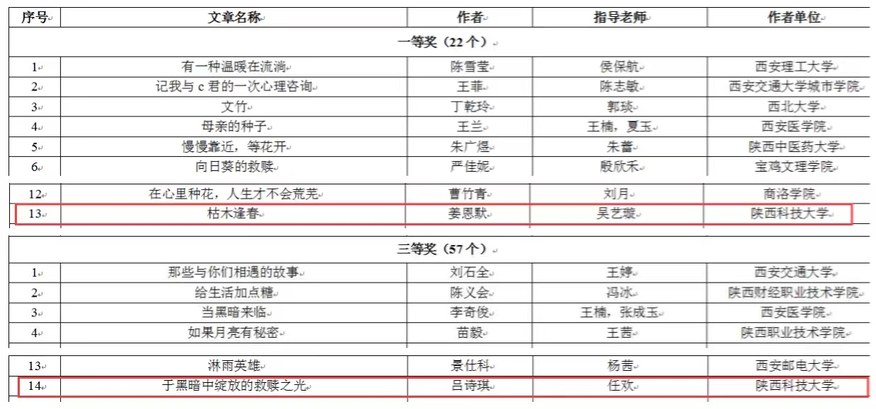 由設(shè)計(jì)與藝術(shù)學(xué)院輔導(dǎo)員吳藝璇指導(dǎo)、學(xué)生姜恩默的征文作品《枯木逢春》榮獲第二屆陜西高?!靶南嘤?愛同行——心理健康教育伴我成長(zhǎng)”主題征文一等獎(jiǎng),該作品講述了遭遇家庭變故而產(chǎn)生心理危機(jī)的大學(xué)生,在家長(zhǎng)、教師、和朋輩的關(guān)心幫助下,獲得心理蛻變與成長(zhǎng)、找尋自我價(jià)值與優(yōu)勢(shì)。由電氣與控制工程學(xué)院輔導(dǎo)員任歡指導(dǎo)、學(xué)生呂詩(shī)琪的征文作品《于黑暗中綻放的救贖之光》榮獲三等獎(jiǎng),該作品講述了一位曾經(jīng)彷徨、迷茫的大一新生,在心理老師的幫助下發(fā)現(xiàn)自我、認(rèn)識(shí)自我、完善自我,度過心理適應(yīng)期、煥發(fā)心理活力的故事。