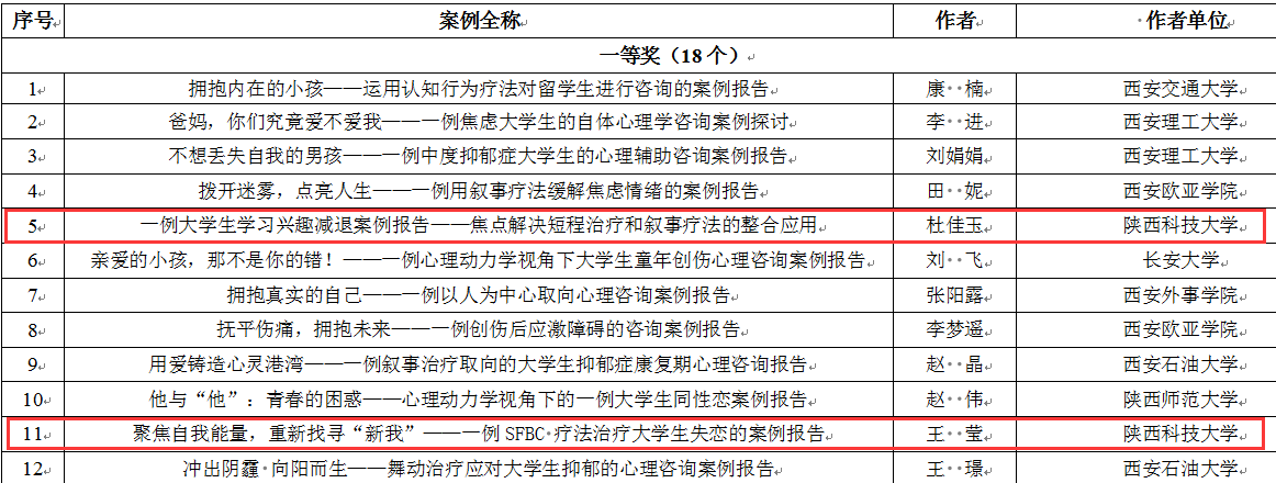 學(xué)工部心理中心教師杜佳玉的心理咨詢案例《一例大學(xué)生學(xué)習(xí)興趣減退案例報(bào)告——焦點(diǎn)解決短程治療和敘事療法的整合應(yīng)用》榮獲第八屆陜西高校心理健康教育優(yōu)秀咨詢案例一等獎(jiǎng),該案例關(guān)注大學(xué)生的學(xué)習(xí)心理困擾和親子問題,綜合運(yùn)用外化、故事重構(gòu)等技術(shù),引導(dǎo)學(xué)生認(rèn)識(shí)自身優(yōu)勢(shì),增強(qiáng)自我價(jià)值感和內(nèi)驅(qū)力。同時(shí),經(jīng)濟(jì)與管理學(xué)院輔導(dǎo)員王瑩的心理咨詢案例《聚焦自我能量,重新找尋“新我”——一例SFBC療法治療大學(xué)生失戀的案例報(bào)告》也榮獲一等獎(jiǎng),該案例引導(dǎo)大學(xué)生科學(xué)理性的看待失戀,運(yùn)用焦點(diǎn)解決技術(shù)幫助學(xué)生樹立正確的戀愛認(rèn)知,激發(fā)自身能量和潛力應(yīng)對(duì)現(xiàn)實(shí)挫折。