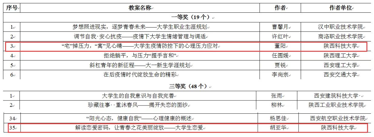學(xué)工部心理中心教師董陽(yáng)的心理教案《“宅”掉壓力,“寓”見心晴——大學(xué)生疫情防控下的心理壓力應(yīng)對(duì)》榮獲第四屆陜西高校心理健康教育優(yōu)秀教案一等獎(jiǎng),該作品聚焦疫情防控背景下大學(xué)生產(chǎn)生的心理壓力感受,幫助學(xué)生積極調(diào)整、科學(xué)應(yīng)對(duì),健康自信的學(xué)習(xí)和生活。電子信息與人工智能學(xué)院輔導(dǎo)員胡亞華的心理教案《解讀戀愛密碼,讓青春之花美麗綻放——大學(xué)生戀愛》榮獲三等獎(jiǎng),該作品通過分析大學(xué)生的戀愛特點(diǎn)、戀愛類型,引導(dǎo)大學(xué)生樹立科學(xué)的戀愛價(jià)值觀,綻放美麗青春。