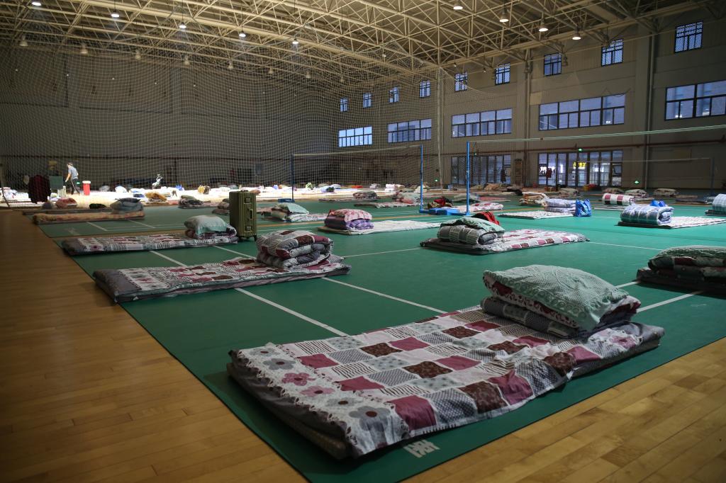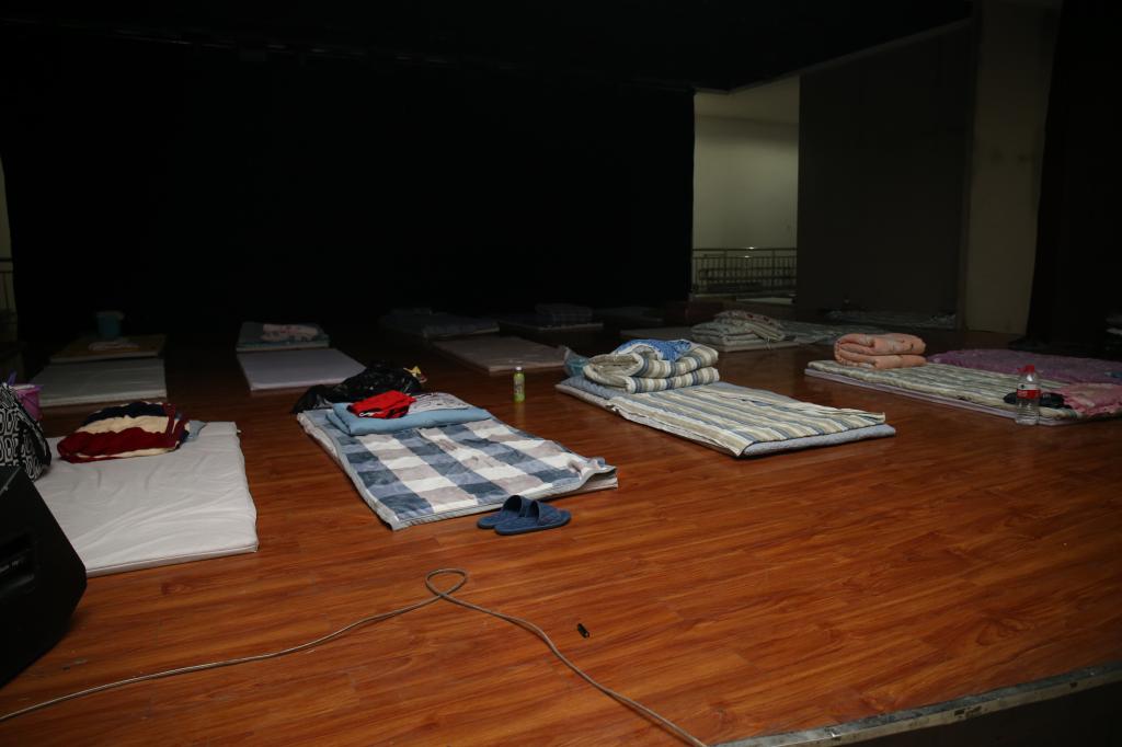 大學(xué)生活動(dòng)中心的場(chǎng)地有限,服務(wù)保障人員只能睡在舞臺(tái)中央。