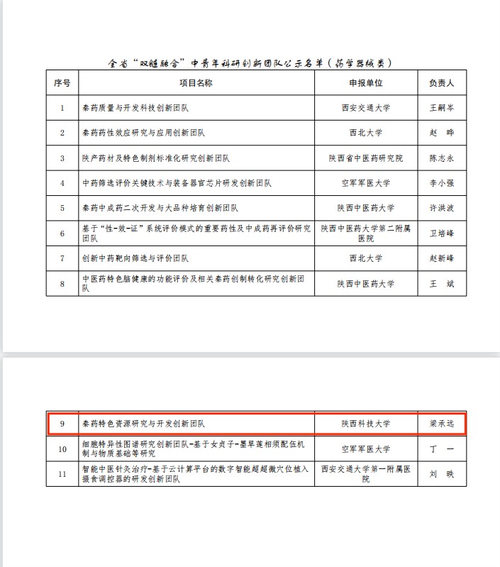 近日,陜西省中醫(yī)藥管理局公布了全省首批“雙鏈融合”中青年科研創(chuàng)新團(tuán)隊名單,我校食品科學(xué)與工程學(xué)院(生物與醫(yī)藥學(xué)院)梁承遠(yuǎn)副教授領(lǐng)銜的“秦藥特色資源研究與開發(fā)創(chuàng)新團(tuán)隊”成功獲批,建設(shè)期3年。今年8月,為加快培育我省中醫(yī)藥中青年科研創(chuàng)新團(tuán)隊,提升我省中醫(yī)藥科研原創(chuàng)能力,進(jìn)一步在秦創(chuàng)原建設(shè)中促進(jìn)我省中醫(yī)藥產(chǎn)業(yè)鏈與創(chuàng)新鏈融合發(fā)展,陜西省中醫(yī)藥管理局在全省組織實施中醫(yī)藥“雙鏈融合”中青年科研創(chuàng)新團(tuán)隊建設(shè)項目。