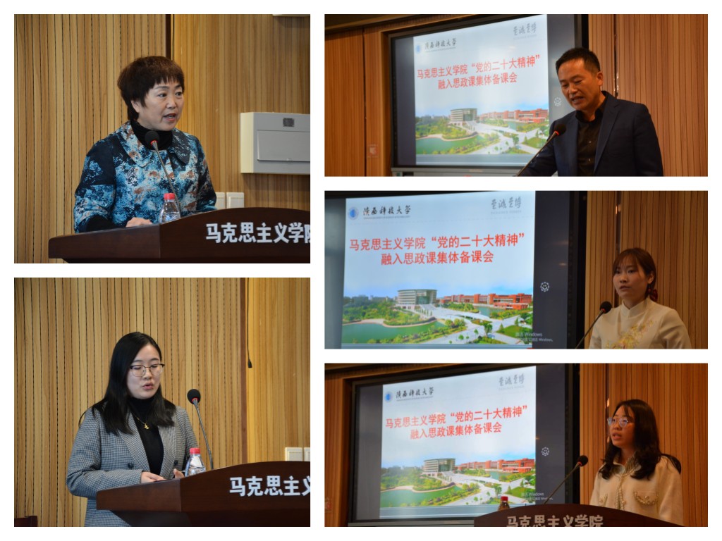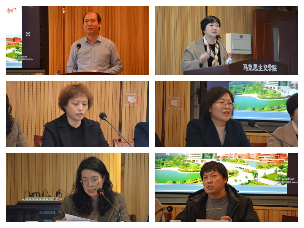 會(huì)上,各教研部主任結(jié)合每門思政課的內(nèi)容和特點(diǎn),著重從理論闡釋、原理運(yùn)用、事例分析、情境課堂、實(shí)踐研學(xué)等多個(gè)角度,匯報(bào)了推動(dòng)黨的二十大精神融入思政課的基本思路和方法路徑?!霸怼苯萄胁恐魅挝拿籼岢?,要準(zhǔn)確把握和領(lǐng)會(huì)黨的二十大報(bào)告的新思想、新觀點(diǎn)、新論斷,結(jié)合馬克思主義基本原理的整體性,突出重點(diǎn),講授關(guān)鍵性、實(shí)質(zhì)性的內(nèi)容?!案耪摗苯萄胁恐魅瓮踟懭阏J(rèn)為,要找準(zhǔn)黨的二十大報(bào)告與“毛澤東思想和中國(guó)特色社會(huì)主義理論體系概論”和“習(xí)近平新時(shí)代中國(guó)特色社會(huì)主義思想概論”兩門課程在教材內(nèi)容上的契合點(diǎn),選擇生動(dòng)鮮活的案例,讓黨的二十大精神“帶著溫度”進(jìn)教案、進(jìn)課堂、進(jìn)學(xué)生頭腦?!熬V要”教研部主任徐瑞仙提出,通過(guò)歷史知識(shí)融入、觀點(diǎn)佐證融入、黨史故事宣講融入、專題式研究融入等“四個(gè)融入”,推動(dòng)黨的二十大精神進(jìn)課堂?!暗路ā苯萄胁繋熆∪A主要介紹了理論融入、實(shí)踐融入、社會(huì)服務(wù)與組織安排等4個(gè)方面的具體舉措,著重說(shuō)明了以“拍”微型電影、“辯”人生哲理、“尋”行業(yè)楷模、“訪”紅色遺跡、“做”志愿服務(wù)、“寫”感恩書信、“講”依法治國(guó)為主題的實(shí)踐教學(xué)融入。針對(duì)形勢(shì)與政策課程所具有的時(shí)事政治性強(qiáng)、內(nèi)容變化快、持續(xù)周期長(zhǎng)的特點(diǎn),“形策”教研部主任周鵬認(rèn)為,要在學(xué)深悟透黨的二十大精神的基礎(chǔ)上,貫通歷史敘事、學(xué)理闡發(fā)和現(xiàn)實(shí)關(guān)照,找準(zhǔn)融入的切入點(diǎn)與側(cè)重點(diǎn),綜合運(yùn)用文獻(xiàn)教學(xué)法、互動(dòng)式教學(xué)、探究式教學(xué)模式等多種教學(xué)方法,帶領(lǐng)學(xué)生深入感受黨的創(chuàng)新理論的魅力。