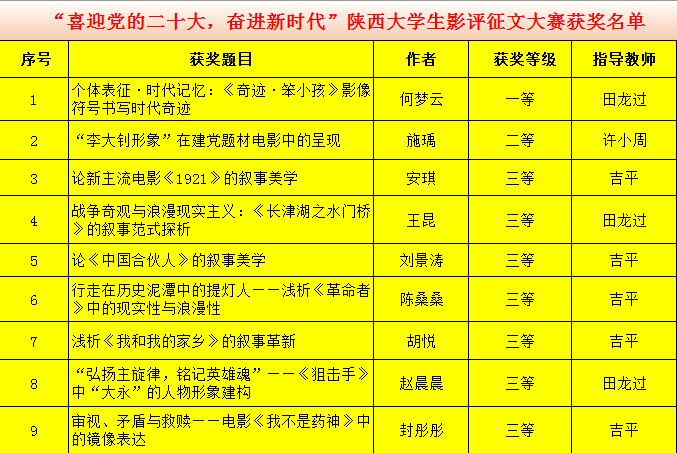 本屆陜西大學(xué)生影評(píng)征文大賽旨在深入學(xué)習(xí)貫徹習(xí)近平總書(shū)記在中國(guó)文聯(lián)十一大、中國(guó)作協(xié)十大開(kāi)幕式上的重要講話(huà)和關(guān)于電影工作的重要指示批示精神;廣泛團(tuán)結(jié)、吸引陜西省內(nèi)相關(guān)專(zhuān)業(yè)高校在校學(xué)生和新的文藝群體,助推陜西高校電影文化建設(shè),激發(fā)大學(xué)生們對(duì)陜西電影乃至中國(guó)電影傾注更多的關(guān)注和熱情,發(fā)掘年輕一代學(xué)生中的電影理論與批評(píng)人才,更好地促進(jìn)陜西電影創(chuàng)作實(shí)踐與理論評(píng)論之間的互動(dòng)。自本屆比賽發(fā)布競(jìng)賽公告起,設(shè)藝學(xué)院就積極組織學(xué)生參與此項(xiàng)賽事,在相關(guān)教師的輔導(dǎo)下,我校向大賽組委會(huì)投送了102篇作品,最終取得9篇獲獎(jiǎng)、8篇入圍的佳績(jī),獲得等級(jí)獎(jiǎng)的同學(xué)將獲得相應(yīng)的獎(jiǎng)金及獲獎(jiǎng)證書(shū)。本屆影評(píng)大賽顯現(xiàn)出了我校學(xué)子較好的理論功底與藝術(shù)素養(yǎng),提高了我校戲劇與影視學(xué)科在陜西高校中的美譽(yù)度。