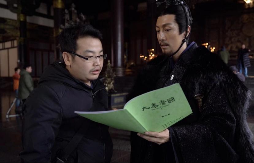 校友秦家樂(左一)在《大秦賦》拍攝現(xiàn)場與演員張魯一對劇本