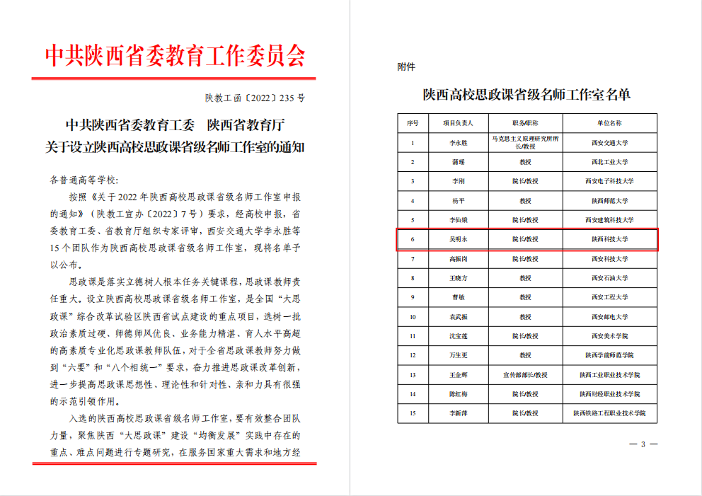近日,中共陜西省委教育工委、陜西省教育廳下發(fā)《關(guān)于設(shè)立陜西高校思政課省級名師工作室的通知》,我校馬克思主義學(xué)院吳明永教授工作室入選。陜西高校思政課省級名師工作室是全國“大思政課”綜合改革試驗區(qū)陜西省試點建設(shè)的重點項目,全省高校共15個教學(xué)團隊入選。