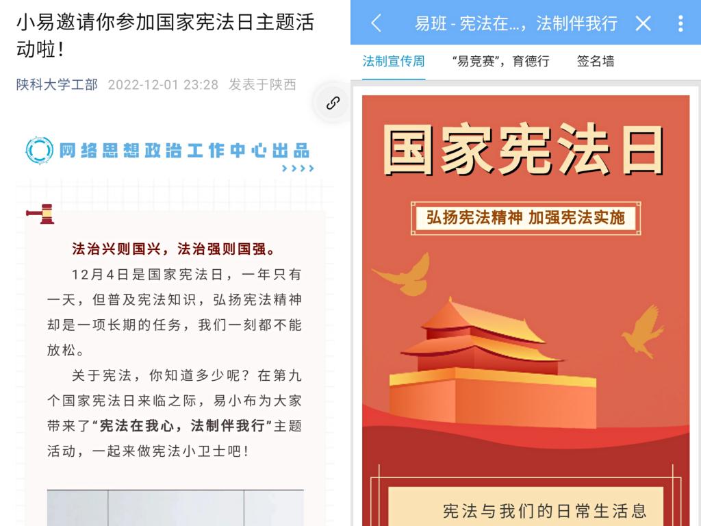 用好網(wǎng)絡(luò)平臺,營造法治文化宣傳氛圍。依托教育部全國青少年普法網(wǎng),開展“憲法衛(wèi)士”在線學(xué)習(xí)活動,8月份以來共動員全校16000余名學(xué)生參與其中,為活動舉辦以來我校參與人數(shù)最多的一年,參與率達(dá)80%以上;依托學(xué)校視頻號、B站等平臺,發(fā)揮學(xué)校大學(xué)生融媒體中心、網(wǎng)絡(luò)文化工作室等學(xué)生組織、團(tuán)隊(duì)的作用,結(jié)合學(xué)校及學(xué)生特點(diǎn)拍攝原創(chuàng)視頻,11月份以來共選拔優(yōu)秀作品進(jìn)行了5期宣傳展示,總播放量達(dá)1W+;校易班發(fā)展中心依托易班網(wǎng)搭建線上學(xué)習(xí)平臺,12月份上線快搭輕應(yīng)用“憲法在我心,法制伴我行”,設(shè)置“‘易’競賽,育德行”“憲法‘易’直在身邊”等模塊,活動參與1300余人次,引導(dǎo)學(xué)生掀起憲法學(xué)習(xí)熱潮。