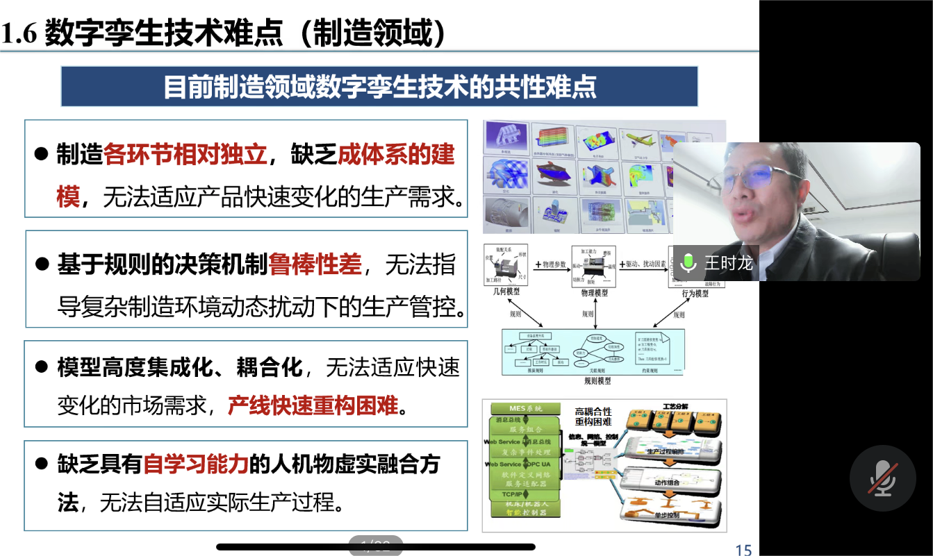 王時(shí)龍?jiān)趫?bào)告中指出,智能制造是新一代人工智能技術(shù)與先進(jìn)制造技術(shù)的深度融合,是新一輪工業(yè)革命的核心驅(qū)動(dòng)力,而數(shù)字孿生和人機(jī)物虛實(shí)融合技術(shù)在制造領(lǐng)域得到了廣泛應(yīng)用。王時(shí)龍就數(shù)字孿生技術(shù)的定義、原型、應(yīng)用、發(fā)展歷程、關(guān)鍵技術(shù)等多個(gè)方面進(jìn)行了詳細(xì)的講解。結(jié)合實(shí)際案例,針對(duì)產(chǎn)品訂單變化、實(shí)時(shí)生產(chǎn)狀態(tài)等,采用數(shù)字孿生和人機(jī)物虛實(shí)融合技術(shù)對(duì)自動(dòng)化生產(chǎn)線進(jìn)行自適應(yīng)重構(gòu)。王時(shí)龍還介紹了其團(tuán)隊(duì)在數(shù)字孿生方面的重大研究成果。