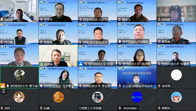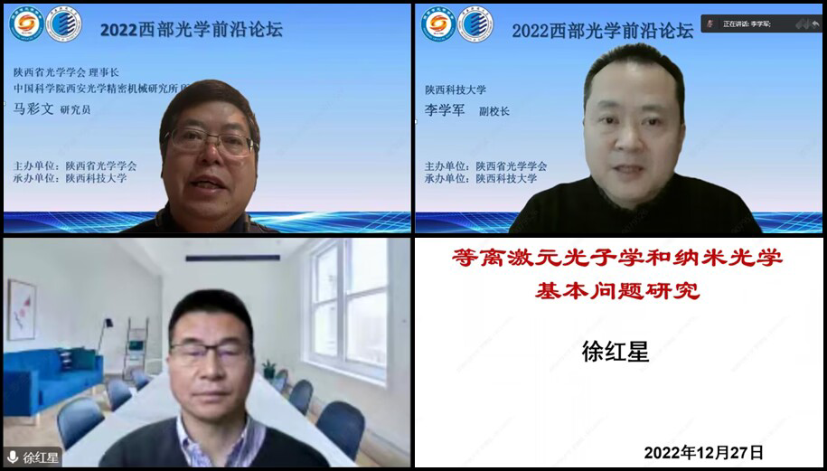 12月26日至27日,由陜西省光學學會主辦、陜西科技大學承辦的“2022年西部光學前沿論壇”在線上舉行。陜西省光學學會理事長、中國科學院西安光學精密機械研究所所長馬彩文研究員,我校副校長李學軍出席會議并致辭。中國科學院院士、武漢大學徐紅星教授,國家杰出青年基金獲得者、中國科學院物理研究所魏志義研究員,國家杰出青年基金獲得者、北京大學肖云峰教授,國家杰出青年基金獲得者、中國科學技術大學史保森教授,國家杰出青年基金獲得者、中國科學技術大學姜海峰教授等省內外130多名專家、學者應邀參加了本次論壇。