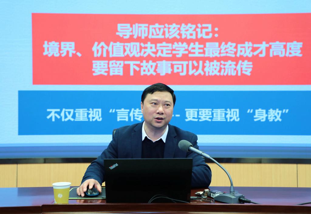 4月13日上午,賴紹聰作了題為《學(xué)高為師德高為范研究生導(dǎo)師的責(zé)任與義務(wù)》的主題報(bào)告。報(bào)告從導(dǎo)師的定義、嚴(yán)于律己德高為范、為人師表學(xué)高為師、創(chuàng)新機(jī)制科學(xué)育人四個(gè)方面,深入交流了研究生導(dǎo)師的責(zé)任與義務(wù),以及如何修煉內(nèi)功才能成為一名合格的導(dǎo)師。賴紹聰在報(bào)告中鼓勵(lì)各位新晉導(dǎo)師要懷有敬畏之心,主動(dòng)擔(dān)當(dāng),因材施教,創(chuàng)新方法,在不斷提高自身科學(xué)素質(zhì)、學(xué)術(shù)水平的同時(shí),鼓勵(lì)和引導(dǎo)研究生成長(zhǎng)成才,勝任新時(shí)代賦予研究生導(dǎo)師的歷史使命。