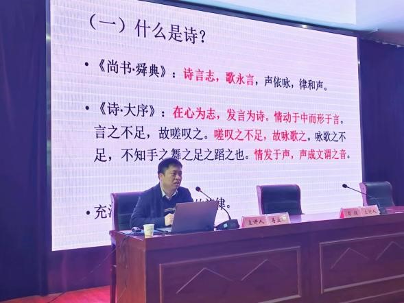 馬立軍教授首先從什么是詩(shī)、什么是詞、詩(shī)與詞的關(guān)系是什么等三個(gè)問(wèn)題入手,依次闡明詩(shī)、詞各自的特點(diǎn)、分類以及詩(shī)詞的分野與背后的文學(xué)觀念等。然后對(duì)知人論世、以意逆志、詩(shī)無(wú)達(dá)詁等基本原則,滋味、意境、寄托、用典等具體方法,皆做了深入淺出的講解。最后推薦了一些詩(shī)詞鑒賞方面的名著,供與會(huì)人員進(jìn)行拓展閱讀。古典詩(shī)詞本身即具有無(wú)窮的魅力。而馬立軍教授在講座過(guò)程中一方面堅(jiān)持利用經(jīng)典作品展開分析,讓聽眾始終有一種熟悉的感覺(jué)。另一方面又以別致的視角與細(xì)致的分析,揭示了這些詩(shī)詞中含而不露的精妙之處,令聽眾耳目一新,收獲良多。一個(gè)半小時(shí)講座中,現(xiàn)場(chǎng)聽眾認(rèn)真而又專注,學(xué)習(xí)氛圍濃厚。