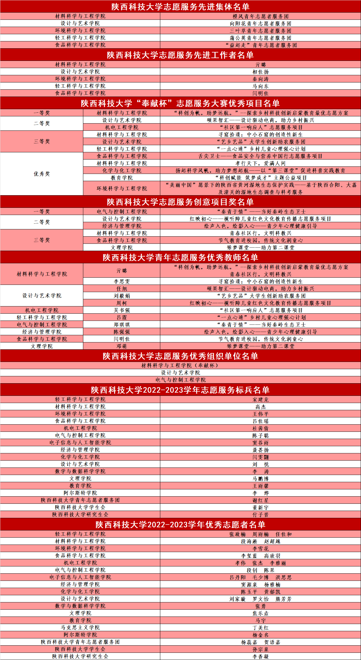 本次大賽的主題是“學(xué)習二十大 永遠跟黨走 青春志愿行”,在第一屆的基礎(chǔ)上,本次大賽新增創(chuàng)新志愿服務(wù)項目賽道,旨在大力宣傳志愿服務(wù)的創(chuàng)新精神,豐富競賽形式和內(nèi)容,激發(fā)學(xué)子創(chuàng)新創(chuàng)造動能。自今年3月份啟動以來,各學(xué)院團委積極響應(yīng),廣大志愿服務(wù)團隊和志愿者踴躍參與,通過自主申報、學(xué)院推薦的方式,共有95個項目和400余名志愿者報名參與。通過學(xué)院推報、資質(zhì)審查、書評評審、路演答辯等環(huán)節(jié),共評選出志愿服務(wù)先進集體5個,志愿服務(wù)先進工作者5名;項目部分共評選出優(yōu)秀項目11個,創(chuàng)新項目獎6個,青年志愿服務(wù)優(yōu)秀教師11名,其中,優(yōu)秀項目賽道評選出一等獎1名,二等獎2名,三等獎3名,優(yōu)秀獎5名,創(chuàng)新項目賽道評選出一等獎1名,二等獎2名,三等獎3名;個人部分評選出志愿服務(wù)標兵17名,優(yōu)秀志愿者32名。最終,材料科學(xué)與工程學(xué)院捧得“奉獻杯”,設(shè)計與藝術(shù)學(xué)院、電氣與控制工程學(xué)院一同獲評“陜西科技大學(xué)志愿服務(wù)優(yōu)秀組織單位”。