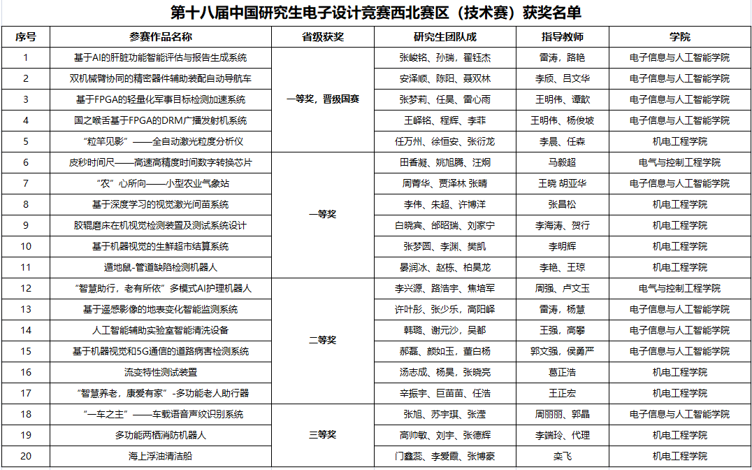 前期,研究生院(研工部)、電子信息與人工智能學院組織了校級選拔賽和多次輔導,邀請校外國內(nèi)頂級專家評審輔導。經(jīng)過精心組織、評審考核及實物作品的不斷調(diào)試完善,最終選拔并推薦20支隊伍參加西北賽區(qū)技術賽。