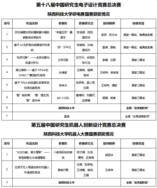 在“兆易創(chuàng)新杯”第十八屆中國研究生電子設(shè)計競賽全國總決賽中,333所高校及科研院所的6289支隊伍經(jīng)過八大分賽區(qū)緊張的初賽評審,共有520余支隊伍中1800余名師生脫穎而出、晉級全國總決賽。我校榮獲國家一等獎2項,二等獎1項,三等獎3項,優(yōu)秀論文獎2項,電子信息與人工智能學(xué)院雷濤教授獲優(yōu)秀指導(dǎo)教師,學(xué)校再次榮獲全國大賽優(yōu)秀組織單位獎。