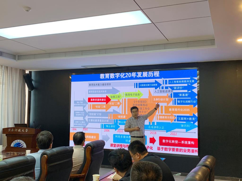 邀請陜西省教育信息化發(fā)展研究中心常務(wù)副主任袁新瑞做專題講座。9月14日下午,我校特別邀請陜西省教育信息化發(fā)展研究中心常務(wù)副主任袁新瑞在逸夫樓506會議室進行了《數(shù)字化轉(zhuǎn)型與智慧校園建設(shè)》的專題講座。黃劍鋒出席活動,網(wǎng)絡(luò)安全和信息化工作組主要負(fù)責(zé)人及信息中心工作人員參加了此次講座。本次講座提出了許多具有前瞻性、專業(yè)性、創(chuàng)新性的觀點,為大家奉獻了一場思想盛宴,也為推動智慧校園的建設(shè)與發(fā)展發(fā)揮了積極作用。