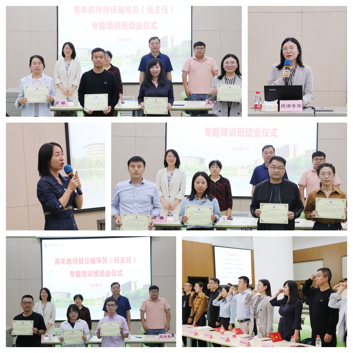 9月21日至9月22日,我校舉辦2023至2024學(xué)年青年教師擔(dān)任輔導(dǎo)員(班主任)專題培訓(xùn)班。組織部、人事處、學(xué)工部等部門負(fù)責(zé)人參加開班及結(jié)業(yè)儀式,來自全校13個(gè)學(xué)院及前沿院共計(jì)100名青年教師在圖書館一樓學(xué)術(shù)報(bào)告廳及教師發(fā)展中心培訓(xùn)室參加培訓(xùn)。儀式由學(xué)工部部長助理王興東主持。