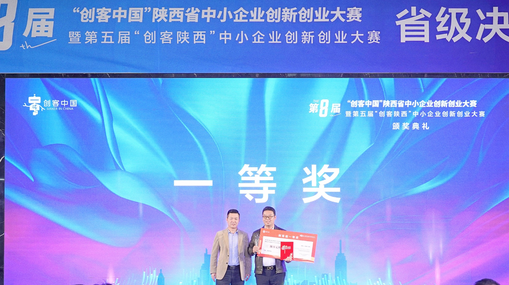 陜西省工業(yè)和信息化廳二級(jí)巡視員沈樹濤為梁承遠(yuǎn)教授(右一)頒獎(jiǎng)