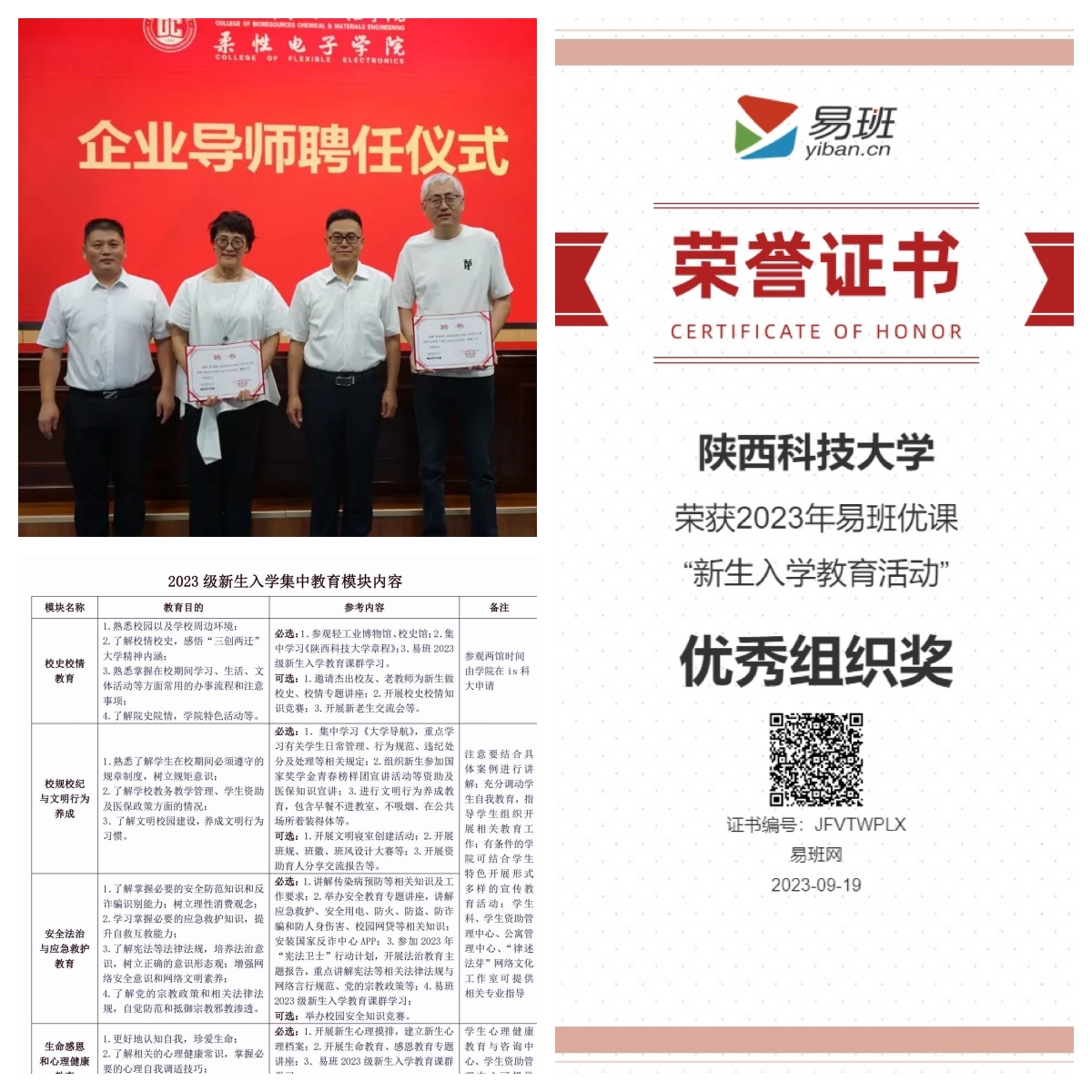 強化系統(tǒng)思維,構(gòu)建入學(xué)教育大格局。學(xué)校將入學(xué)教育看作一個有機整體,系統(tǒng)謀劃“做什么”“誰來做”“怎么做”。育人主體更加多元。校內(nèi)多部門聯(lián)動,學(xué)工、網(wǎng)絡(luò)思政、團委、教務(wù)等多部門與各二級學(xué)院共同研制《本科新生入學(xué)教育方案》并推動落實;輕工科學(xué)與工程學(xué)院(柔性電子學(xué)院)舉辦“輕工文化月”新生系列活動,邀請學(xué)術(shù)帶頭人、優(yōu)秀校友代表共同為新生上好“入學(xué)第一課”;各學(xué)院利用迎新廣泛開展新生家長見面會,家校合力助推新生盡快適應(yīng)大學(xué)生活。育人內(nèi)容更加豐富。將入學(xué)教育劃分為集中教育和系列專題教育兩個階段,覆蓋新生入學(xué)后的整個學(xué)期;集中教育以“做‘三創(chuàng)兩遷’精神新傳人”為主題,貫穿迎接新生、開學(xué)典禮、軍事訓(xùn)練各個環(huán)節(jié);開展系列專題教育,涵蓋校史校情、校紀校規(guī)、感恩與生命教育等7個模塊、23個必選動作、14個自選動作,既有思政課、愛國課,也有安全課、心理課。育人形式更加新穎。采取線上教育與線下教育相結(jié)合、課堂講授與實踐教學(xué)相結(jié)合、教師指導(dǎo)與朋輩輔導(dǎo)相結(jié)合的方式進行,充分發(fā)揮學(xué)校網(wǎng)絡(luò)思想政治工作優(yōu)勢,前置入學(xué)教育,新生未入校先進班,累計建立入學(xué)教育課群12個,學(xué)校榮獲2023年度全國易班優(yōu)課“新生入學(xué)教育活動”優(yōu)秀組織獎。