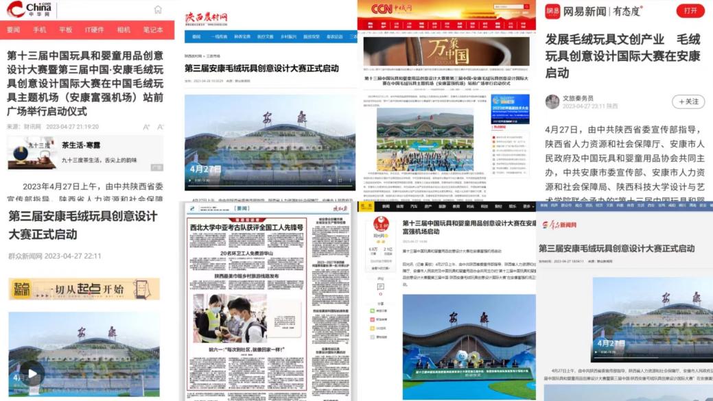 中國(guó)·陜西安康毛絨玩具創(chuàng)意設(shè)計(jì)國(guó)際大賽在安康市人民政府的大力支持和中國(guó)玩具和嬰童用品協(xié)會(huì)的大力推動(dòng)下,連續(xù)三屆舉辦大賽致力于搭建產(chǎn)教聯(lián)合體,促進(jìn)教育鏈、人才鏈與產(chǎn)業(yè)鏈、創(chuàng)新鏈的“四鏈融合”,推進(jìn)政府、企業(yè)、學(xué)校、科研機(jī)構(gòu)的“四方聯(lián)動(dòng)”,實(shí)實(shí)在在用設(shè)計(jì)學(xué)科服務(wù)地方產(chǎn)業(yè)。安康“一賽一會(huì)”的行業(yè)影響力日趨凸顯,為安康毛絨玩具文創(chuàng)產(chǎn)業(yè)高質(zhì)量發(fā)展注入了創(chuàng)新活力,正在成為最具影響力的全國(guó)毛絨玩具行業(yè)品牌活動(dòng)之一。大賽活動(dòng)先后被群眾新聞網(wǎng)、中國(guó)城市新聞網(wǎng)、起點(diǎn)新聞、陜西日?qǐng)?bào)等多家媒體宣傳報(bào)道,引起行業(yè)院校及社會(huì)各界的熱烈反響。