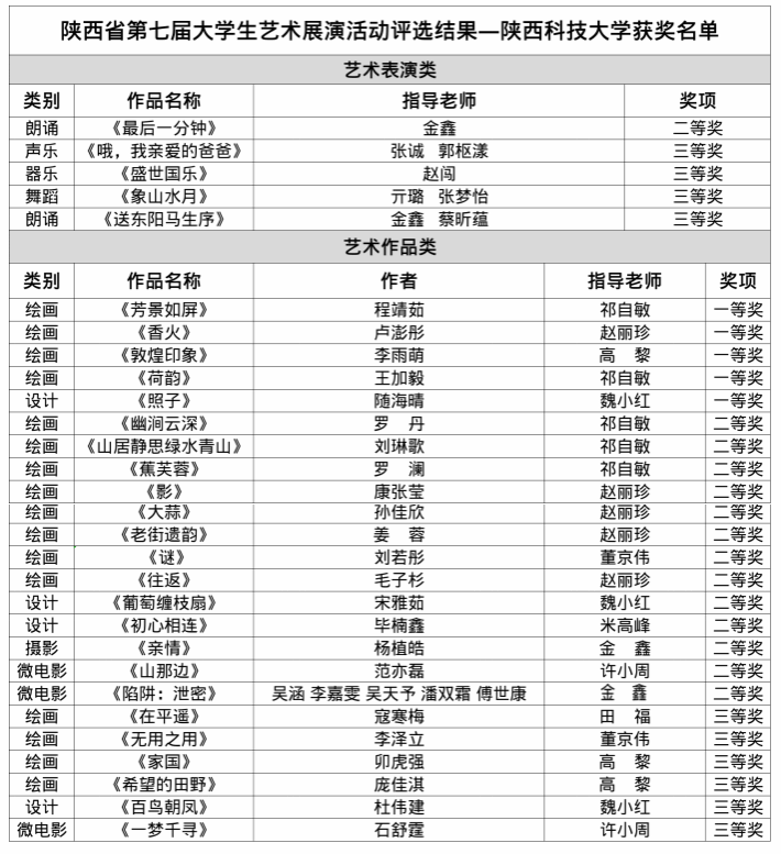 近日,由陜西省教育廳主辦的全省第七屆大學生藝術展演活動圓滿落下帷幕。我校學子在本屆賽事中共斬獲29項獎項,取得歷史最好成績,充分展現(xiàn)了學生的藝術修養(yǎng)和學校的美育成果。