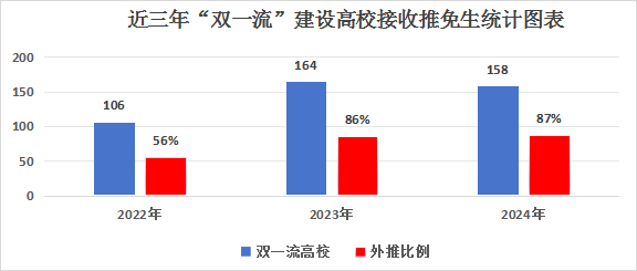 積極拓寬推薦本校優(yōu)秀本科生到“雙一流”建設(shè)高校免試攻讀碩士學(xué)位工作。2024年“雙一流”建設(shè)高校推薦人數(shù)占全校普通推免計劃的87%。2024年學(xué)校有158名優(yōu)秀應(yīng)屆本科畢業(yè)生被推薦到“雙一流”建設(shè)高校攻讀研究生(含直博生5名),學(xué)校推免生校外推薦比例和高校質(zhì)量不斷提升。