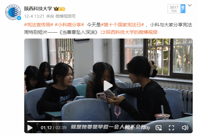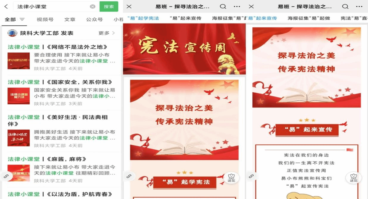 線上引流“云”普法更入腦入心。依托學(xué)校視頻號、B站等線上平臺,發(fā)揮大學(xué)生融媒體中心、網(wǎng)絡(luò)文化工作室、大學(xué)生藝術(shù)團(tuán)等學(xué)生組織、團(tuán)隊的作用,錄制《憲法伴我們成長》快閃宣傳視頻等,將專業(yè)難懂的法律知識演繹成通俗易懂的普法“微視頻”,共選拔優(yōu)秀作品進(jìn)行了20余期宣傳展示,總播放量達(dá)10W+;在學(xué)校官網(wǎng)制作5期宣傳圖說,在官方微博以趣味問答的形式開展了為期9天的民法典知識普及活動,閱讀人次達(dá)2W+;在易班網(wǎng)推出“民法典伴我行”線上答題活動和優(yōu)課課群“‘易’起學(xué)憲法”等,活動參與總共6000余人次。