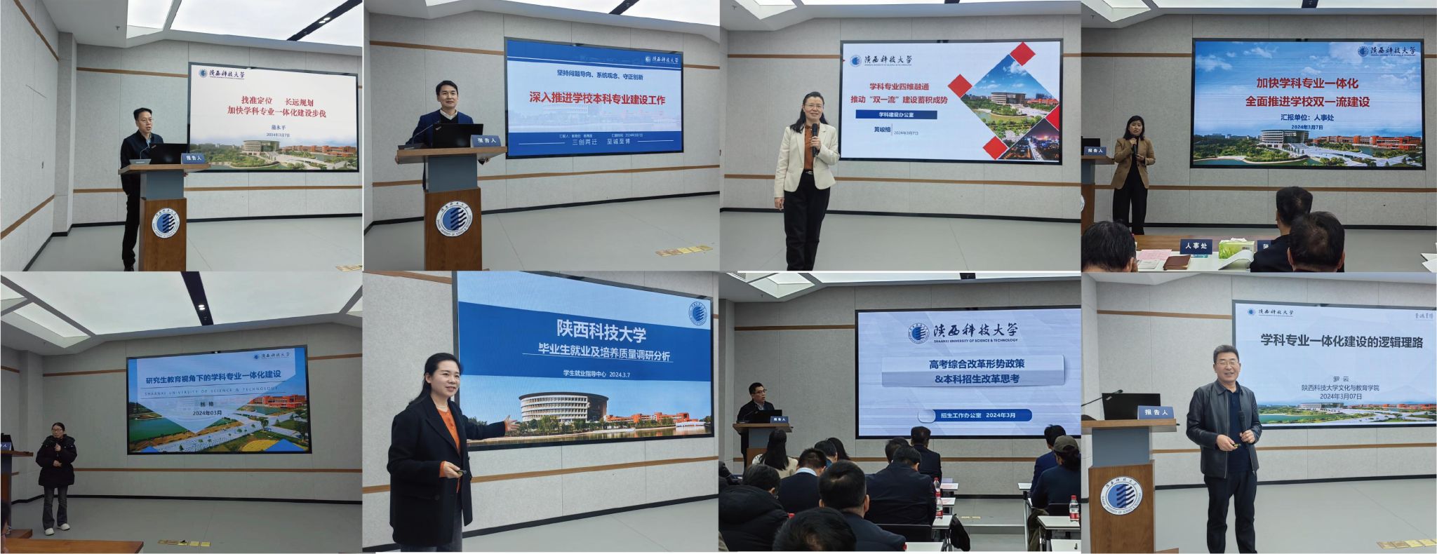 教務(wù)處、學(xué)科辦、人事處、研究生院、學(xué)工部、招生辦、文教學(xué)院負(fù)責(zé)同志分別基于前期調(diào)研分析結(jié)果及我校學(xué)科發(fā)展現(xiàn)狀做專題報告。報告人梳理亮點、剖析不足、規(guī)劃路徑、明確重點,圍繞深入推進(jìn)本科專業(yè)建設(shè)工作、學(xué)科專業(yè)四維融通、學(xué)科專業(yè)一體化建設(shè)視域下師資隊伍建設(shè)、研究生教育視角下的學(xué)科專業(yè)一體化建設(shè)、畢業(yè)生就業(yè)與培養(yǎng)質(zhì)量調(diào)研分析、高考綜合改革形勢與學(xué)校本科招生改革、學(xué)科專業(yè)一體化建設(shè)的邏輯理路等方面內(nèi)容進(jìn)行匯報。