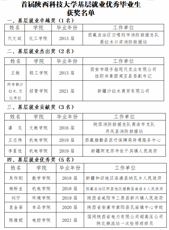 為積極響應國家鼓勵高校畢業(yè)生到西部、到基層就業(yè)創(chuàng)業(yè)戰(zhàn)略,進一步優(yōu)化學校人才培養(yǎng)結構,教育和引導畢業(yè)生樹立扎根基層、服務西部的就業(yè)觀和擇業(yè)觀,我校于本學期啟動“陜西科技大學首屆基層就業(yè)優(yōu)秀畢業(yè)生評選活動”。4月26日,該項活動評選及公示環(huán)節(jié)正式結束,共評選出以化學與化工學院2013屆畢業(yè)生代文斌、輕工科學與工程學院(柔性電子學院)2013屆畢業(yè)生王馳、經(jīng)濟與管理學院(亞歐貿(mào)易與數(shù)字經(jīng)濟學院)2021屆畢業(yè)生阿布都沙拉木.艾比布拉等為代表的11名基層就業(yè)優(yōu)秀畢業(yè)生。