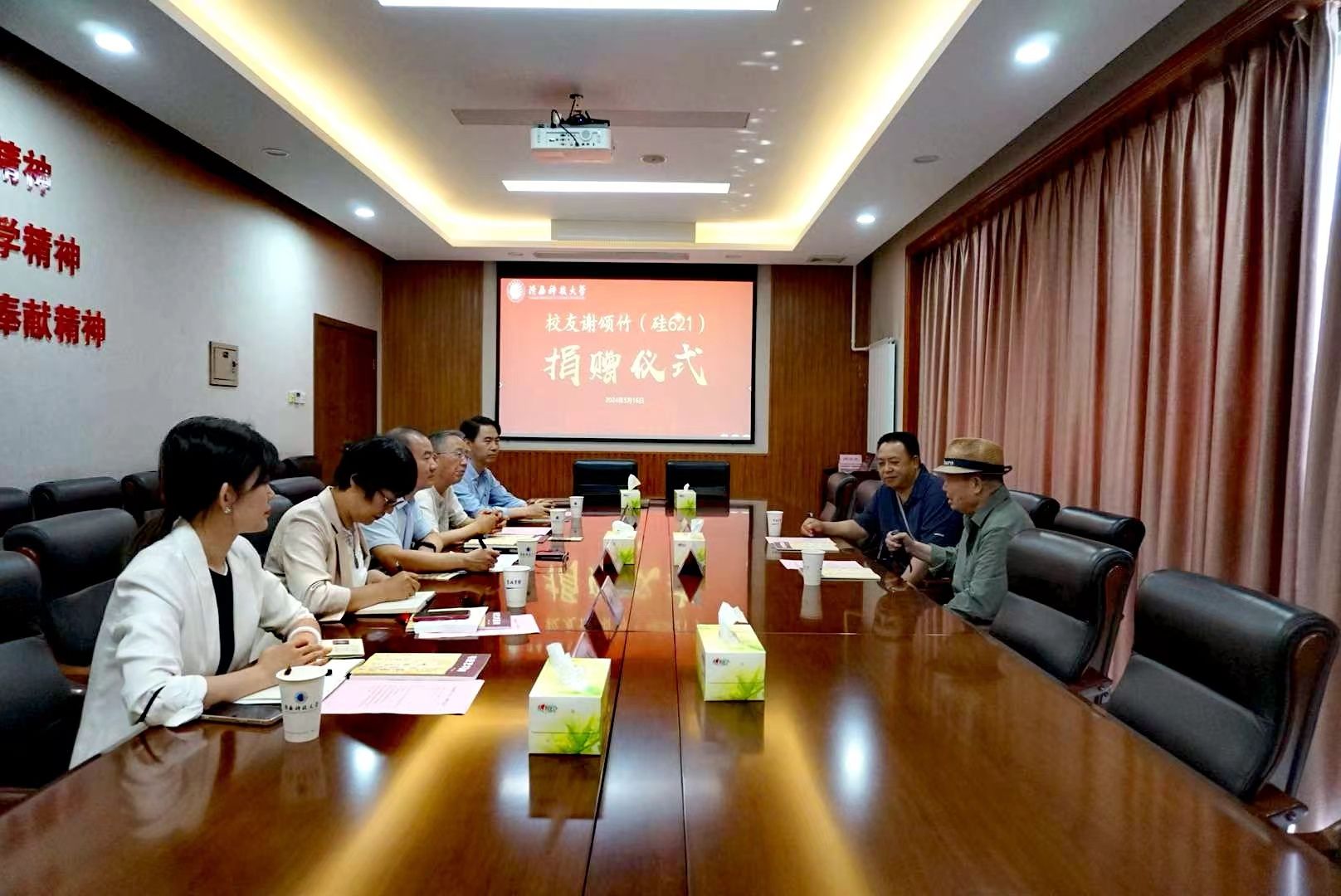 5月16日上午,學(xué)校迎來(lái)了一位特殊的客人——北輕老八屆校友謝頌竹(硅621),他懷著對(duì)母校的深厚感情,向母校捐贈(zèng)了自己的著作和書(shū)畫(huà)作品。校友總會(huì)顧問(wèn)王宏、檔案館副館長(zhǎng)鄭勇、設(shè)計(jì)與藝術(shù)學(xué)院副教授祁自敏參加捐贈(zèng)儀式,儀式由校友總會(huì)辦公室主任殷立雄主持。